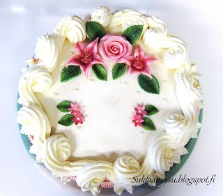Koristelu: Kukat ja lehdet sokerimassaa.