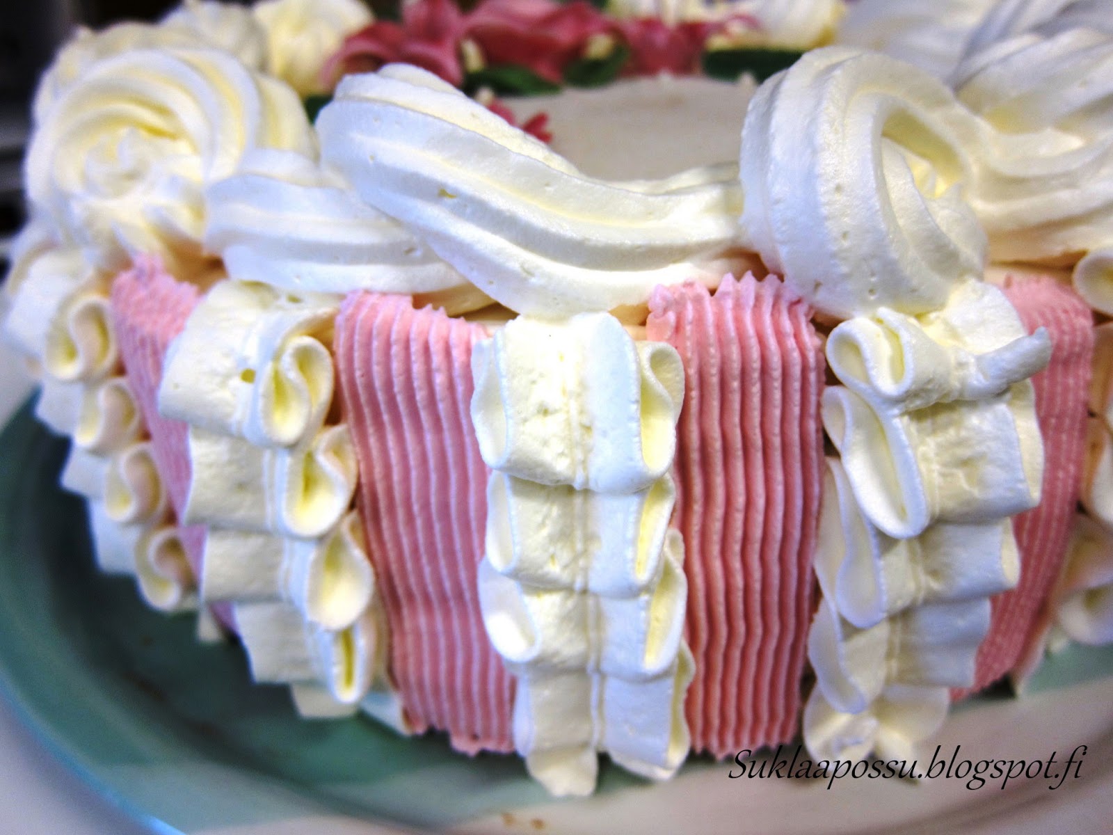 Pursotuksissa käytetty 2 prk flora vispiä + 100 g tuorejuustoa + 2 tippaa voi-vaniljaesanssia + sokeria. Koripunostyllalla tehdyt raidat värjätty rose-pastavärillä.