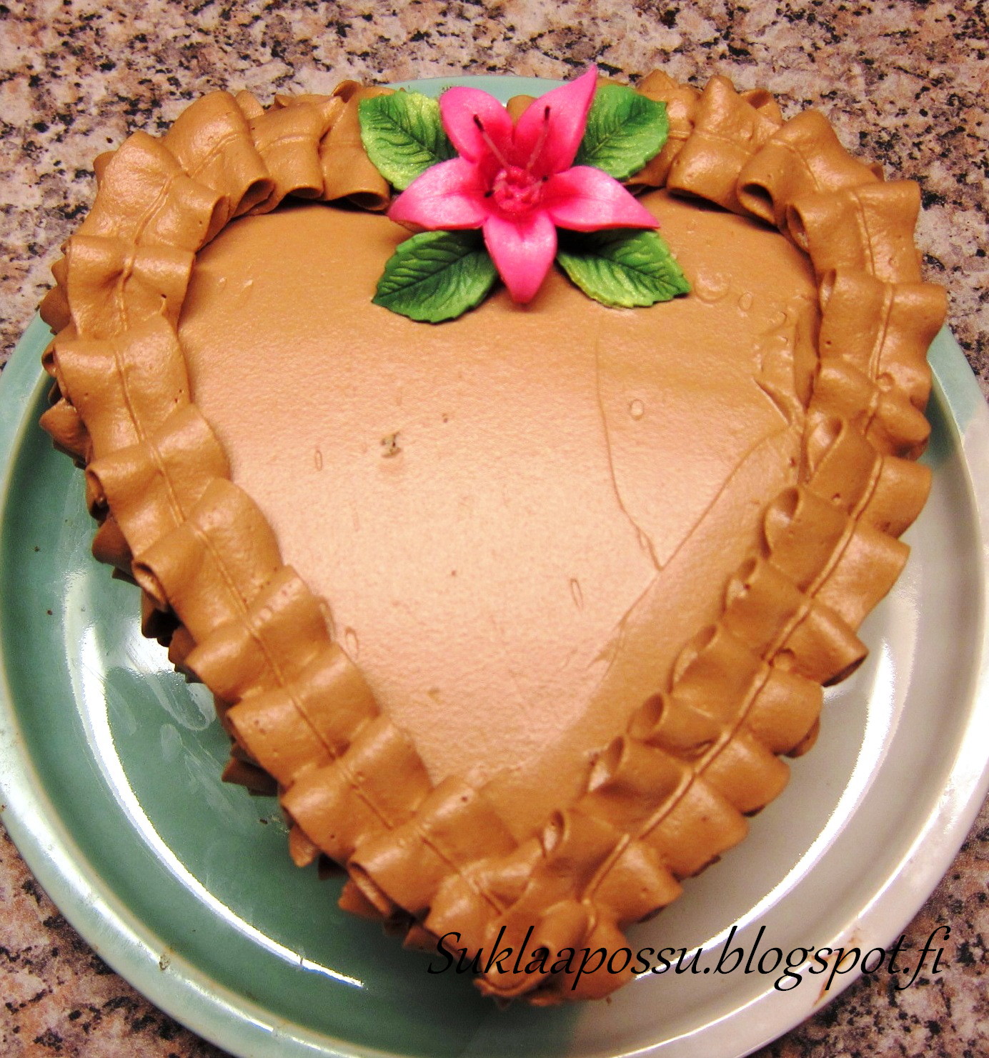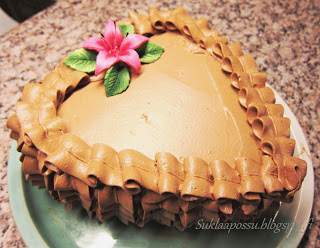 Pohjana kahden munan kaakaosokeripohja, paistettu 16 cm sydänreunavuoassa 175 asteessa n.30 min.