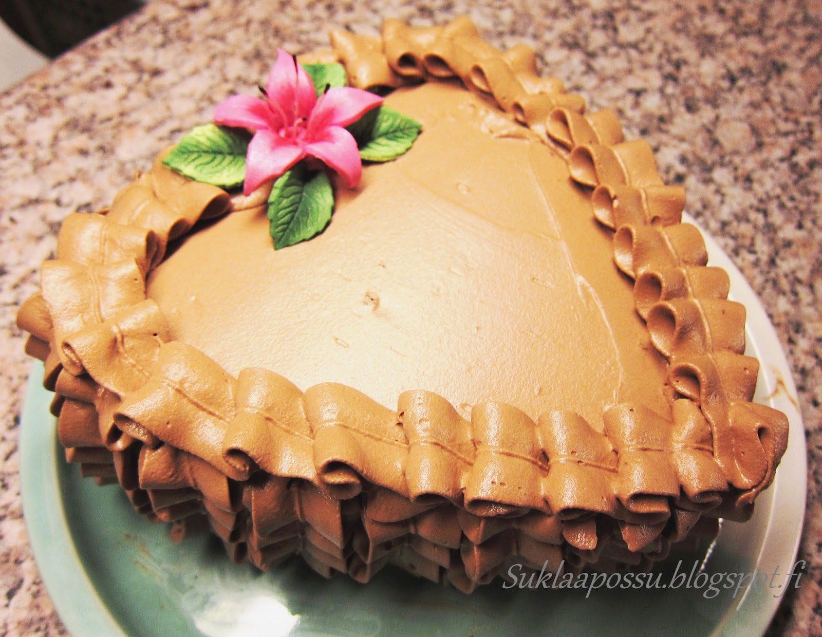Kuorrutus suklaakermaa lehtityllalla. Piti tehdä päälle ”kiekuroita”, mutta kerma uhkasi loppua kesken, joten tein vaan lehtityllapursotukset siihenkin.