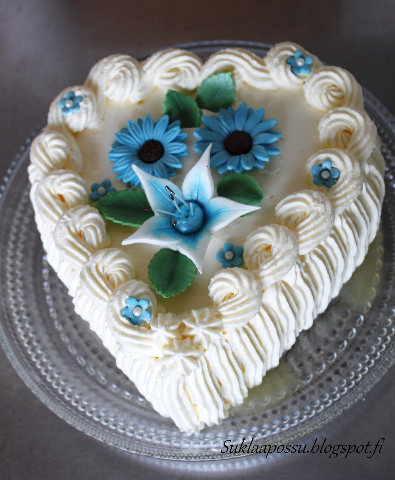 Koristeet tehty sinisellä värjätystä sokerimassasta.