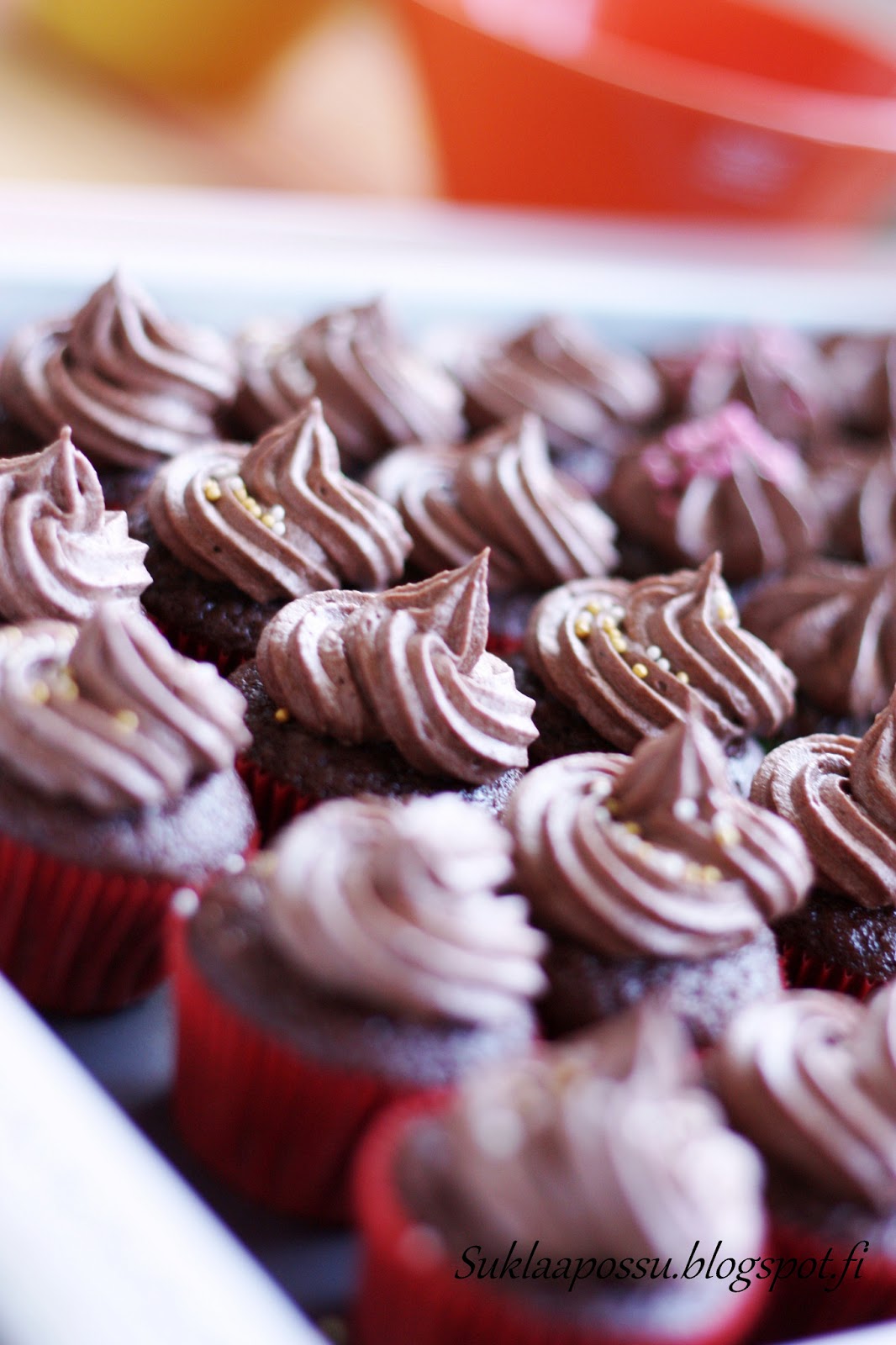 Sulata kuorrutuksen margariini. Sekoita kaikki aineet yhteen. Laita seos jääkaappiin jähmettymään. Kun seos kylmää, vatkaa se kuohkeaksi ja pursota tai levitä muffinien päälle. Koristele haluamallasi tavalla esim. nonparelleilla.