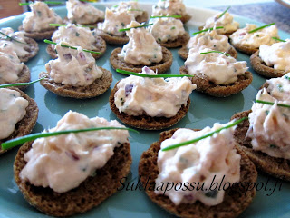 Tein tätä lohitahnaa kahteen juhlaan viikon välien. Ensimmäisellä kerralla laitoin tahnan palttoonappien päälle. Ne menivät kuin kuumille kiville ja loppuivat kesken. Eikä ihme, hyviä kun olivat! Toisella kerralla palttoonapit olivat kadonneet kaupasta, joten laitoin tahnan ruissipsien päälle. Ne hieman imivät tahnan kosteutta itseensä, vaikka muuten olivatkin hyviä. Palttoonapit ovat siis tähän tarkoitukseen parempia.