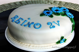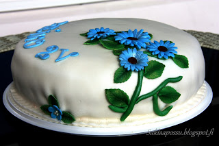 Päällys vaniljan makuista vaahtokarkkimassaa, jota meni n. 1 kg. Päällyksen laitto jännitti etukäteen hirmuisesti. Eikä se ihan ongelmitta sujunutkaan. Päällys repesí ja aivan väärästä paikkaa. Piti koko kakun koristelu miettiä äkkiä uudestaan. Massan päällä suihkaus kimallesprayta.