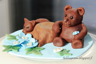 Tieto kakuntekoinnostani on kiirinyt eteenpäin ja sain töissä pyynnön tehdä kakun 2-vuotiaan pojan synttäreille. Ainoa pyyntö oli, että kakussa esiintyisi karhu. Halusin harjoitella muovailemista, joten tein kakkuun tällaisen karhu-aiheisen koristeen. Kettu (vai mikälie metsäneläin) kurkkii kukkien takaa..