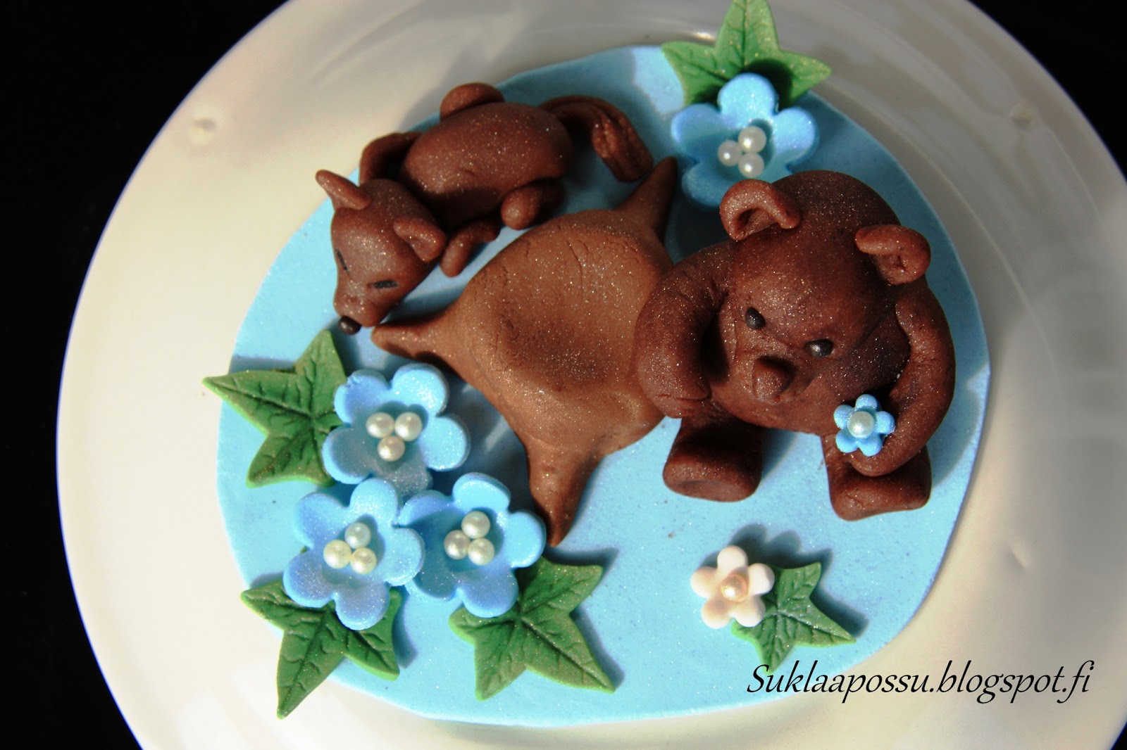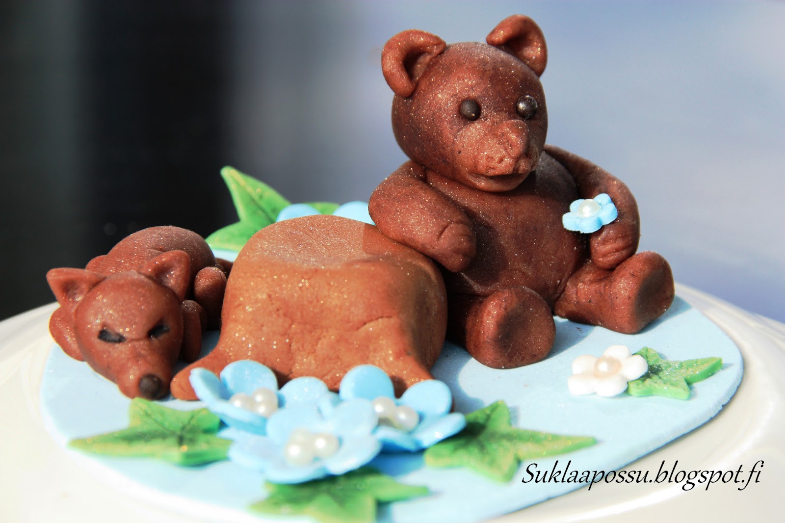 Tieto kakuntekoinnostani on kiirinyt eteenpäin ja sain töissä pyynnön tehdä kakun 2-vuotiaan pojan synttäreille. Ainoa pyyntö oli, että kakussa esiintyisi karhu. Halusin harjoitella muovailemista, joten tein kakkuun tällaisen karhu-aiheisen koristeen. Kettu (vai mikälie metsäneläin) kurkkii kukkien takaa..