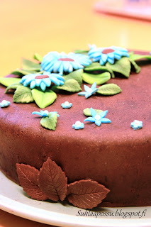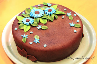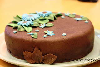 Olin epäileväinen mieheni työpaikalle tekemästäni mango-suklaakakun täytteen ja pohjan yhteensopivuudesta, joten päätin tehdä varmuudeksi myös toisen kakun miehen työpaikalle. Toiveena alunperinkin oli tiramisu ja suklaa, joten tässä piirteitä molemmista. Lopulta tiramisumaista kakussa on ainoastaan se, että kakku kostutettiin kahvilla (4 kahvimitallista pikakahvia/n. 3dl vettä). Amarettokin jäi alkoon.. Molemmat kakut kuitenkin maistuivat erittäin hyvin ja varsinkin tätä suklaakakkua kehuttiin paljon.