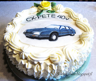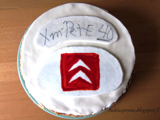Pete toivoi 40 v kakukseen XM-kakkua (automerkki) nimimerkkinsä mukaisesti. Pete lähetteli liudan XM-kuvia, jotta kuvasta tulisi näköinen. Me muut päätimme kuitenkin tehdä kakkuun viestiksi tulevan lahjan kuvan (CX), joten alkuperäisajatus sai häipyä. Tälläinen oli siis eka versio kakusta, jonka Pete näki. Hymy hyytyi melko pian kakun näkemisen jälkeen ja kuulin pienen nielauksenkin. Oliko tämä muka niin kamala?