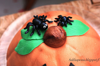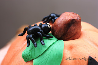Silmät, nenä ja suu leikattu sekä hämähäkit muovailtu kick-karkeista. Hämähäkit alkoi lötsähtää pikku hiljaa, joten pieni sokerimassalisä olisi ehkä auttanut hämiksiä pysymään paremmin jaloillaan.