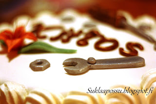 Kakun päällä oli muutama ruuvi, meisseli ja jakoavain sekä pieni oranssi lilja. Kiitos-teksti ja ruuvimeisselin varsi tehty suklaamassasta, muut sokerimassasta.