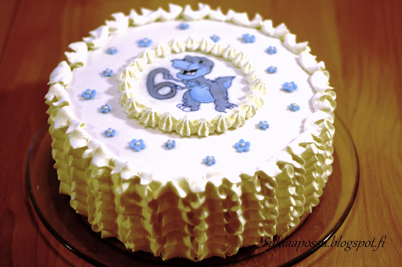 Veljen pojan suosikkisarja oli Dinot ja Dinoista Jomppe oli ehdoton suosikki. Kakun aihe syntyi tämän pohjalta. Maalasin Dinon tomuväreillä sokerimassalevylle.