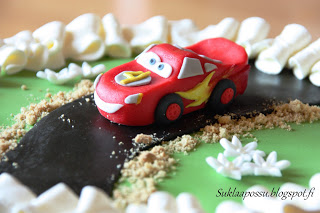 Veljenpoika toivoi syntymäpäiväkakkuunsa Salamaa. Koska olin jo aiemmin tehnyt yhden Salamakakun piirtämällä auton sokerimassan pintaan, halusin tällä kertaa piirtämisen sijasta koittaa tehdä sen muovailemalla. Auto tunnistettiin kuin tunnistettiinkin Salamaksi, joten voinen olla tyytyväinen muovailutulokseeni 🙂