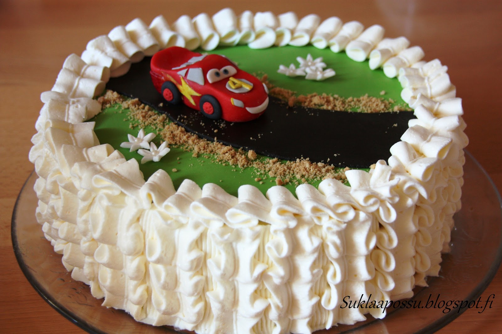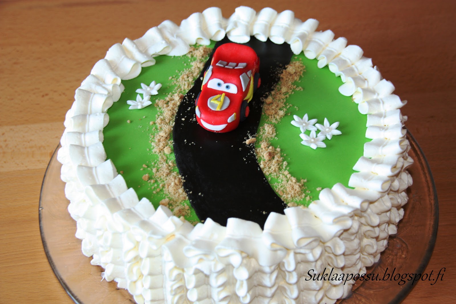 Veljenpoika toivoi syntymäpäiväkakkuunsa Salamaa. Koska olin jo aiemmin tehnyt yhden Salamakakun piirtämällä auton sokerimassan pintaan, halusin tällä kertaa piirtämisen sijasta koittaa tehdä sen muovailemalla. Auto tunnistettiin kuin tunnistettiinkin Salamaksi, joten voinen olla tyytyväinen muovailutulokseeni 🙂