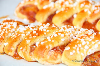 Jatkossa teen luultavammin kevyellä pullataikinalla kaikki pitkot ja muut, missä kunnolla täytettä. Mieskin yllättäen tykkäsi, vaikkei omenahillosta yleensä välittäkään. Näihin voi toki käyttää myös normaalia pullataikinaa.