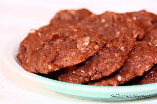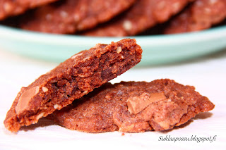 Sekoita vehnäjauhoihin kaakaojauhe, leivinjauhe ja suola. Sekoita hieman jäähtyneeseen margariinisulaan sokerit ja lisää munat yksitellen hyvin vatkaten. Siivilöi joukkoon jauhoseos. Lisää rouhittu suklaa ja kookoshiutaleet. Sekoita taikina tasaiseksi. Nostele lusikalla tai sormilla pyöritellen lihapullan kokoisia nokareita pellille. Jätä leviämisvaraa. Paista 175 asteessa n. 8-10 min.