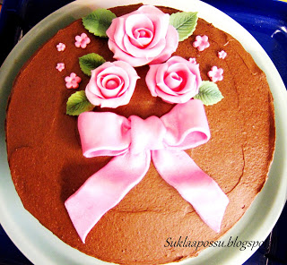 Alla olevassa kakussa käytin tätä kuorrutteena. Kuorrute oli pehmeää, mutta levitystaito ei ollut kakuntekohetkellä vielä hyppysissä, niin levitysjäljet näkyvät..
