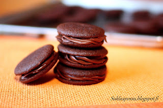 Nami, nami ja nami! Jos pitää suklaasta, pitää taatusti näistä!Käytin osan whoopies-leivoksista pakkasen kautta ja ne kestivät sen oikein hyvin. Pakastaminen oikeastaan teki näille vain hyvää