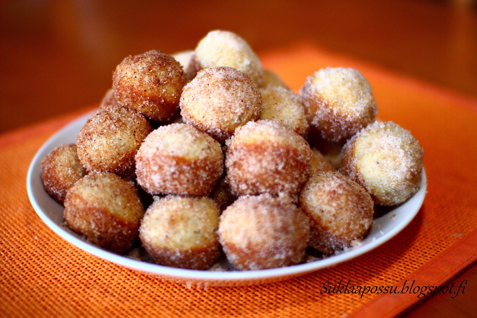 Kasta donitsit uunilämpimänä kuumaan voisulaan muutama kerrallaan, laita tassille odottamaan kun kierittelet kaneli-sokeriseoksessa yksitellen. Donitseja voisi kuorruttaa myös esim. tomusokerikuorruteella.