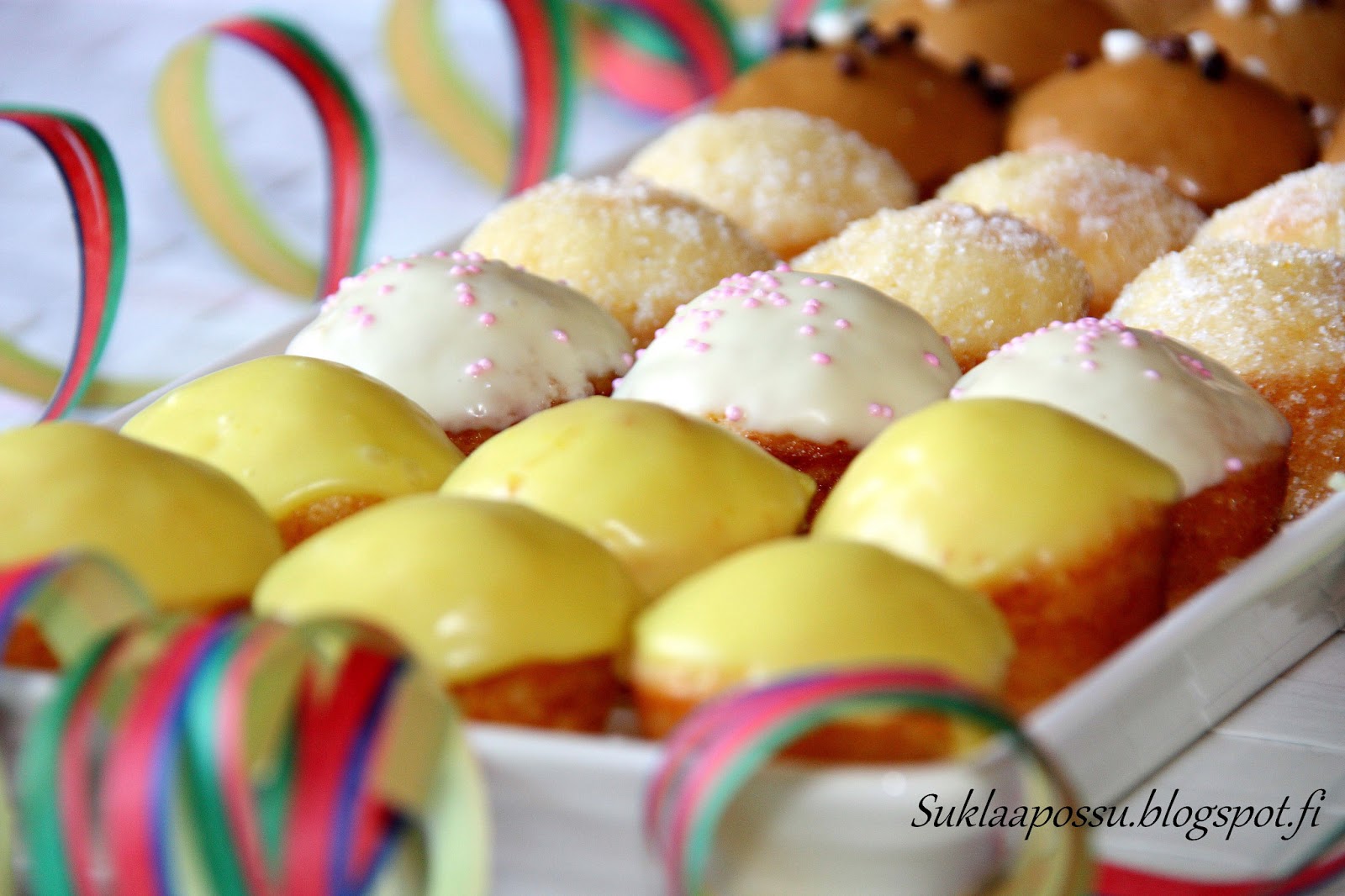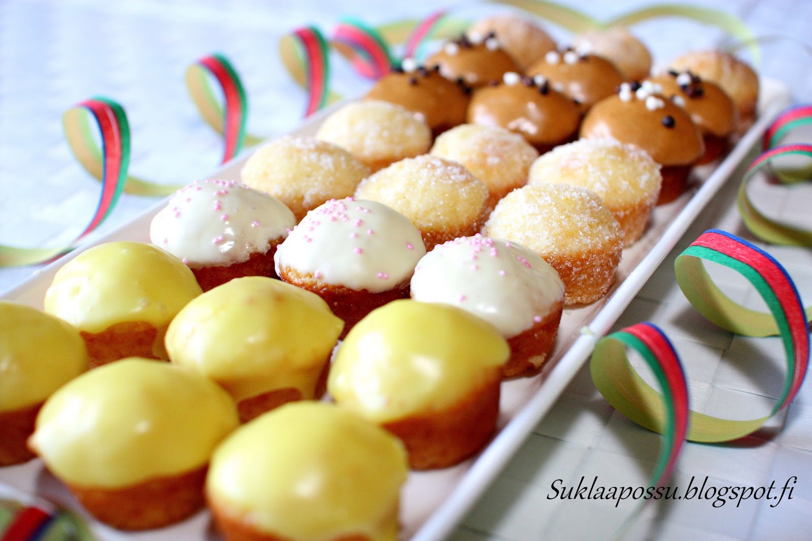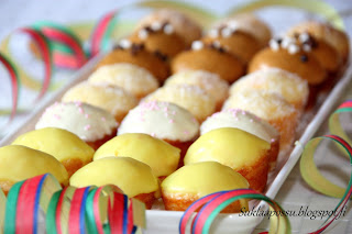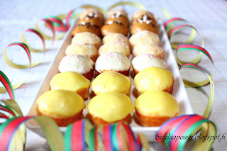 Vapun kunniaksi tein uunissa sekä tavallisia donitseja että näitä sitruunaversioita. En tosin tiedä voiko näitä donitseiksi edes kutsua, koska nämä tehdään minimuffinipellillä eivätkä nämä, ainakaan minulle tuttuun tapaan, sisällä kardemummaa. Mutta tekotapa ja taikina on muuten liki sama kuin edellisessä donitsipostauksessani, joten sanon näitä donitseiksi.