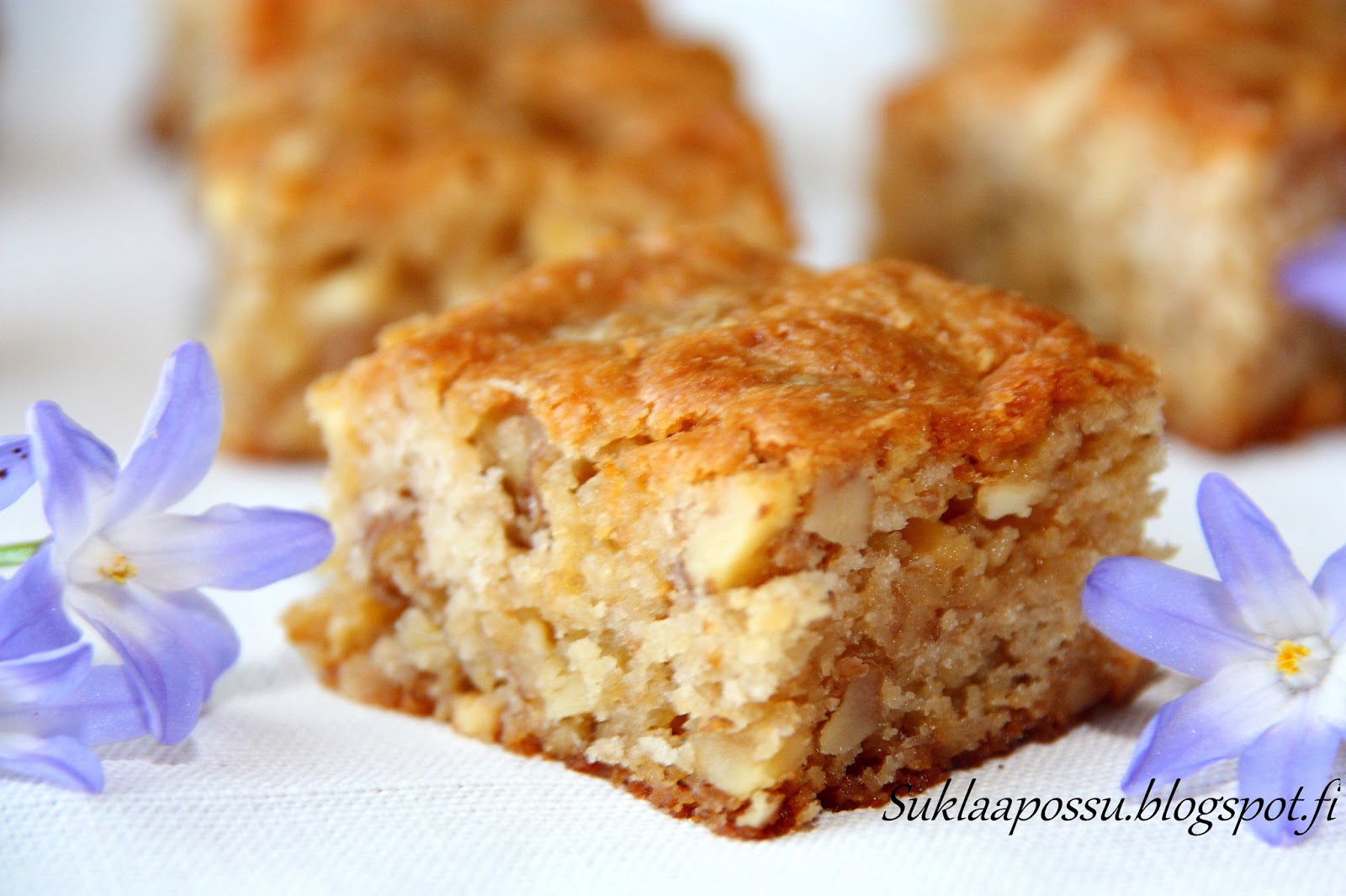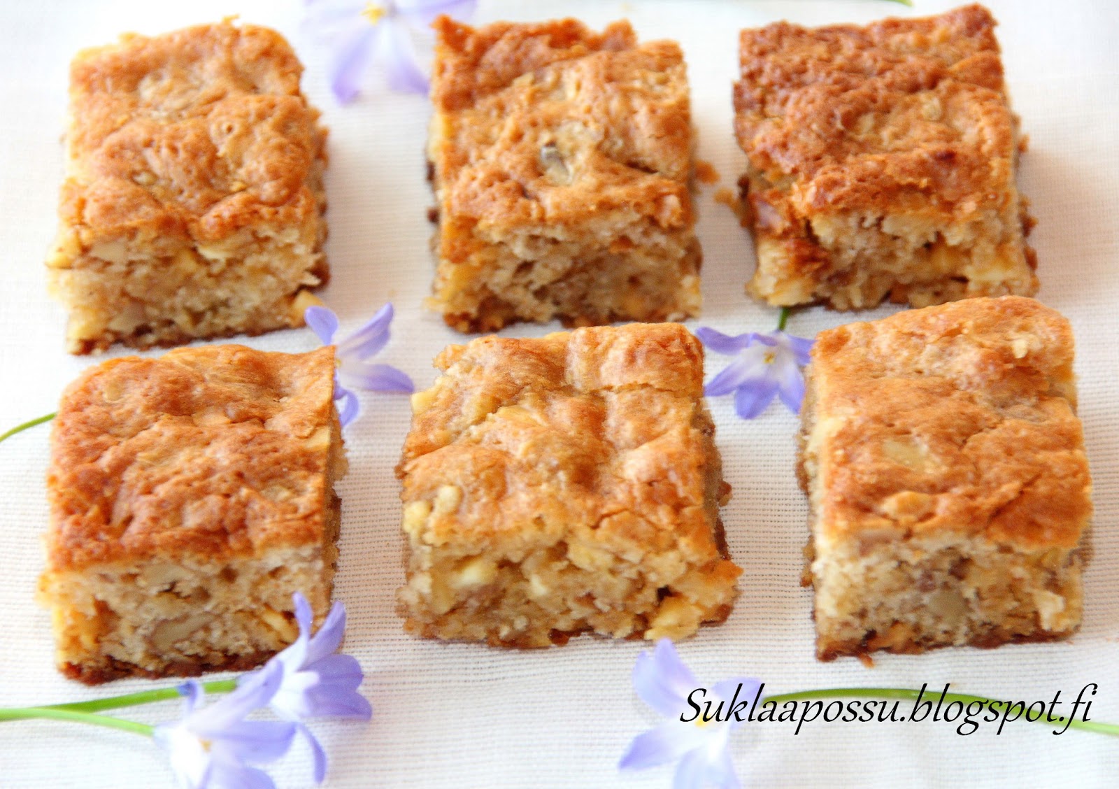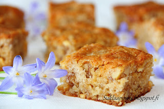 Aineet: 175 g + 75 g valkosuklaata 50 g voita 100g Saksanpähkinöitä 2 munaa 0.8 dl sokeria 1 tl vaniljajauhetta 0.5 tl leivinjauhetta 1.25 dl vehnäjauhoja