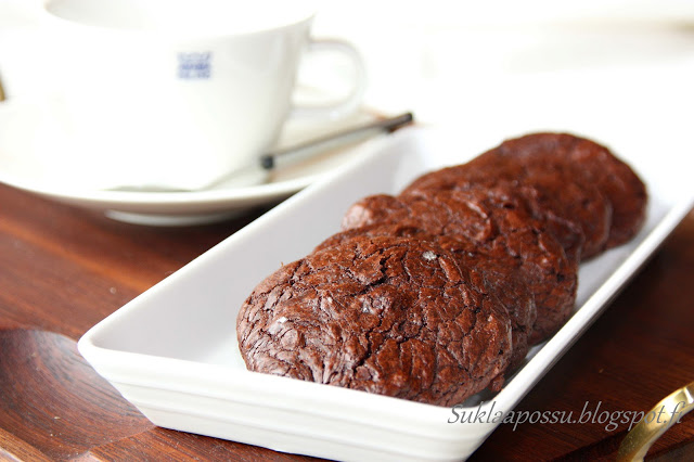 Tämäkin ohje löytyi Suklaapandan sivuilta. Mainos keksien tahmaisuudesta, pehmoisuudesta ja suklaisuudesta iski heti. Kekseihin tuli myös ripaus suolaa pinnalle. Ensimmäinen ajatus oli, ettei siitä voi olla muuta kuin hyötyä. Käytänhän itsekin usein suolaa suklaan parina ja se sopii mielestäni erittäin hyvin tuoden suklaan aromit kunnolla esille. Ja hyviähän nämä olivatkin! Hieman sitkeitä, mutta kuitenkin ah, niin ihanan suklaisen pehmeitä. Maku muistutti jonkin verran jo blogista löytyviä pehmeitä suklaakeksejä, mutta nämä olivat selkeästi suklaisemmat. Tein pari pienen pientä muutosta, alkuperäisohjeet sulkeissa ja täällä.