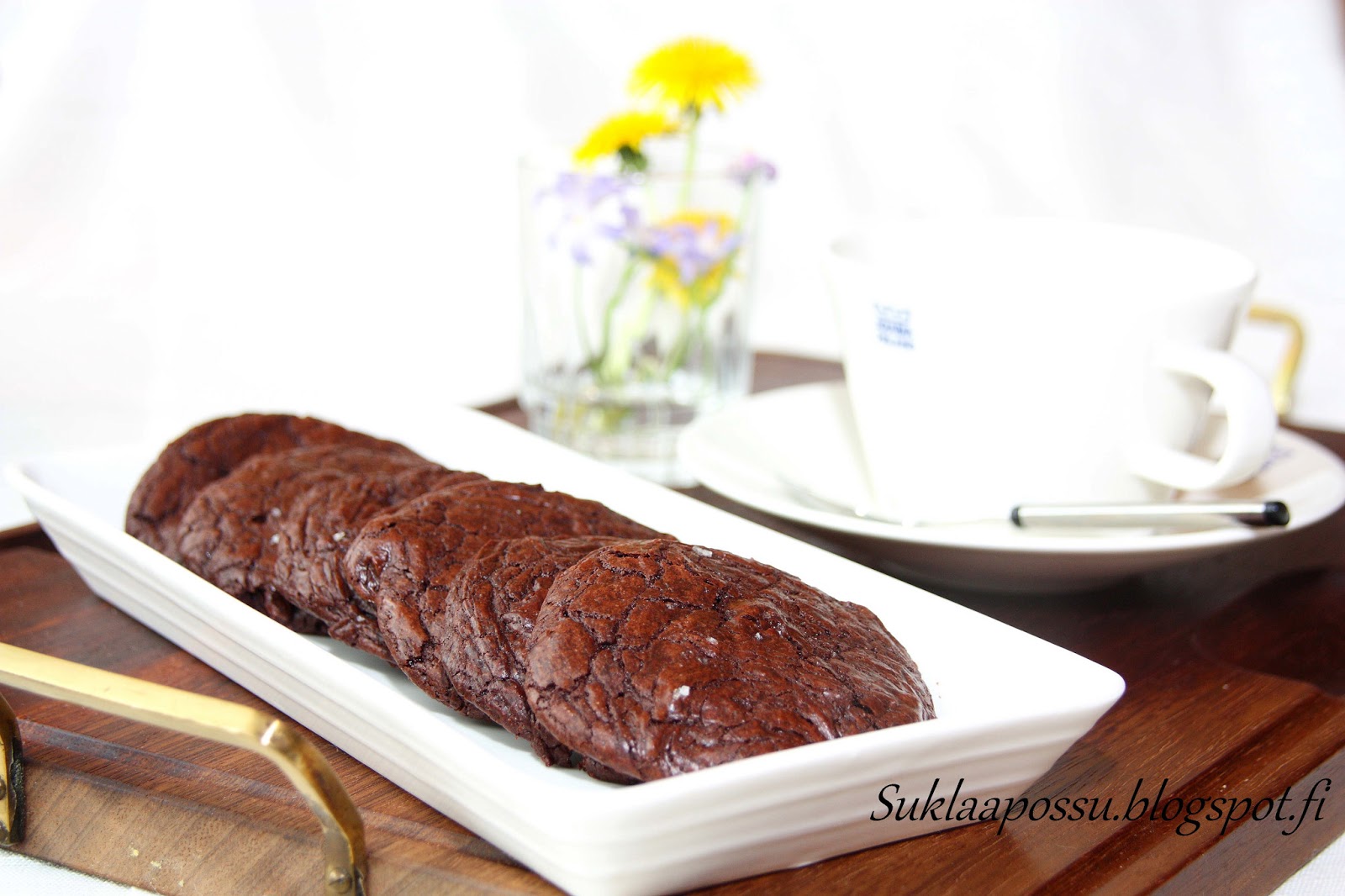 Tämäkin ohje löytyi Suklaapandan sivuilta. Mainos keksien tahmaisuudesta, pehmoisuudesta ja suklaisuudesta iski heti. Kekseihin tuli myös ripaus suolaa pinnalle. Ensimmäinen ajatus oli, ettei siitä voi olla muuta kuin hyötyä. Käytänhän itsekin usein suolaa suklaan parina ja se sopii mielestäni erittäin hyvin tuoden suklaan aromit kunnolla esille. Ja hyviähän nämä olivatkin! Hieman sitkeitä, mutta kuitenkin ah, niin ihanan suklaisen pehmeitä. Maku muistutti jonkin verran jo blogista löytyviä pehmeitä suklaakeksejä, mutta nämä olivat selkeästi suklaisemmat. Tein pari pienen pientä muutosta, alkuperäisohjeet sulkeissa ja täällä.