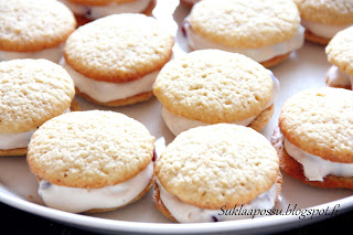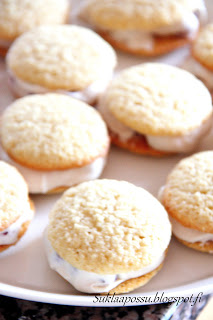 Tämä on toinen kerta kun teen näitä ihania puolukkaisia mascarpone whoopies-leivoksia. Nämä pääsivät heti valmistumisen jälkeen pakkaseen odottamaan vieraita. Nämähän kestävät pakastamisen erinomaisesti ja mielestäni jopa ehkä hieman paranevat siellä. Kuvat on siis otettu ilman koristuksia. Päälle ajattelin laittaa vielä joko tomusokerihunnun tai valkosuklaaspritsaukset. Laitan sitten paremmat kuvat, kun saan nämä kahvipöytään (mikäli ehdin ottaa sellaiset).