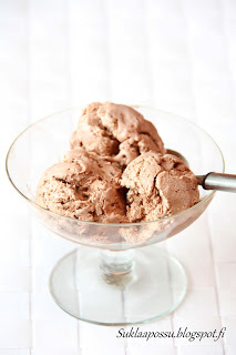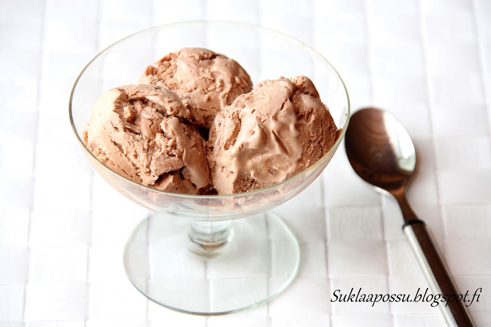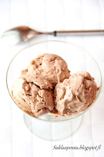 Aloin tekemään suklaajäätelöä Ihana Suklaa-kirjani herkullisen oloisella ohjeella, mutta siitä tulikin sananmukaisesti munakokkelia. Suklaa oli jo sulatettu, joten piti äkkiä soveltaa jokin toinen resepti. Jatkoin jäätelölinjalla ja tein kondensoitua maitoa käyttäen tämän pikajäätelön. Jälkikäteen huomasin, että suklaan joukkoon lisätty kuohukermapurkki oli turha ja söi ehkä turhan paljon suklaan makua. No mutta hyvää tämä silti oli! 🙂
