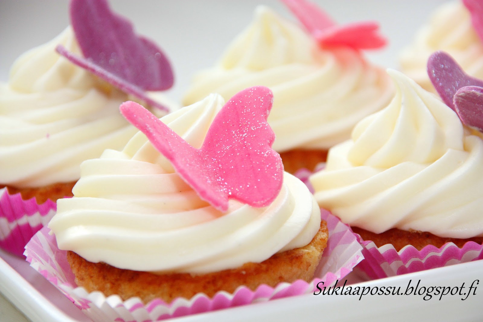 Nämä muffinit ovat ihanan pehmeitä ja meheviä! Ananas näissä ei juurikaan maistu, vaan se tuo vain lisämehevyyttä. Koostumus todella ihana! Kestävät pakastamisenkin, vaikka hieman kostuivat päältä. Päälle kuitenkin tulee pursotukset, joten pieni kostuminen ei haittaa.