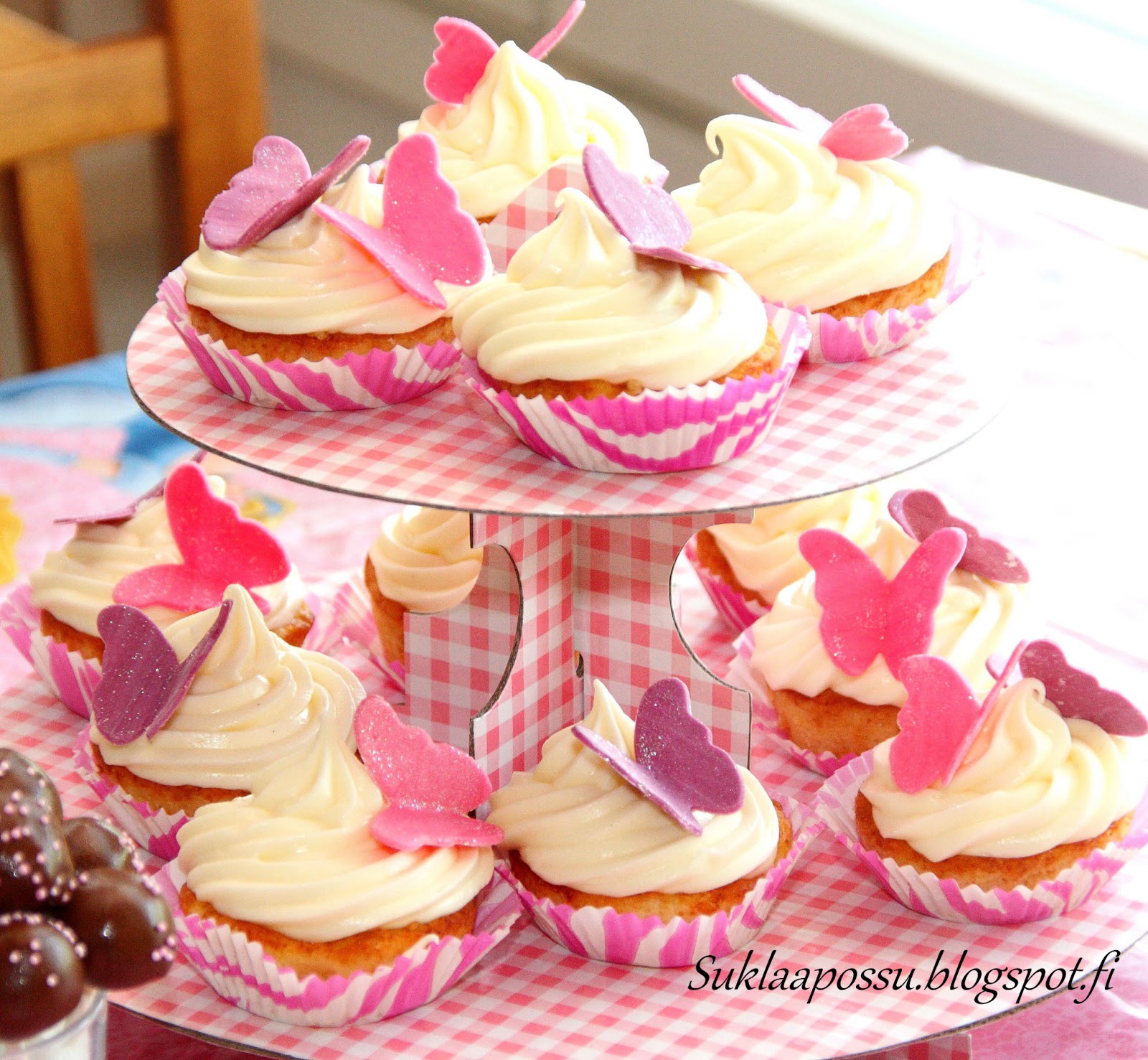 Tulipa räpsästyä vielä nopeasti kuva juhlapöydässä olevista muffineista telineessään..