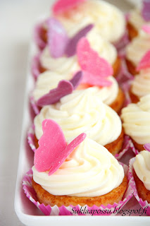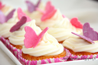 Kuorrute temppuili (johtunee helteestä) ja vaikka lisäilin tomusokeria aina vaan enemmän ja enemmän, ei koostumuksesta tahtonut tulla sopiva. Lopulta pistin seoksen jääkaappiin ja se jähmettyi siellä pursotuskuntoon n.tunnissa ja lopulta muffinien päällä tiukaksi kuorrutteeksi. Eli ensi kerralla vähemmän tomusokeria ja aiemmin jääkaappiin jähmettymään. Kuorrutus oli nyt todella makea ja makuuni hieman liian raskas. Paremmin olisi varmaan sopinut raikas sitruunavivahteinen kermavaahto pienellä tuorejuustolisällä? Vaikka tosin maun ja mehevyytensä puolesta nämä muffinit eivät edes kaipaisi kuorrutetta!