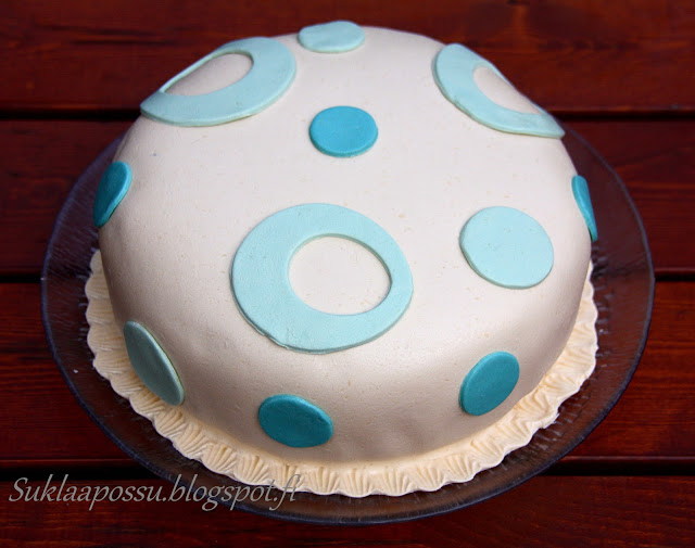 n. 400 g valkosuklaamassaa (kakun ja kuorrutteen välissä ohut pinta laktoositonta vispikermaa vispattuna)