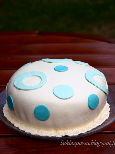 Tein mökille tuliaisiksi tällaisen kakun. Halusin testata täysin laktoosittoman täytteen tekemistä tulevaa kakkutilausta varten, koska en ollut koskaan ennen tehnyt sellaista. Koska kuorrute tulisi olemaan valkosuklaamassaa, täytteeksi toivottiin jotain raikasta, joten tein vadelma-sitruunatäytteen. Valkosuklaamassa ei tosin ole laktoositon, mutta kakun tilaaja toivoi sitä silti.