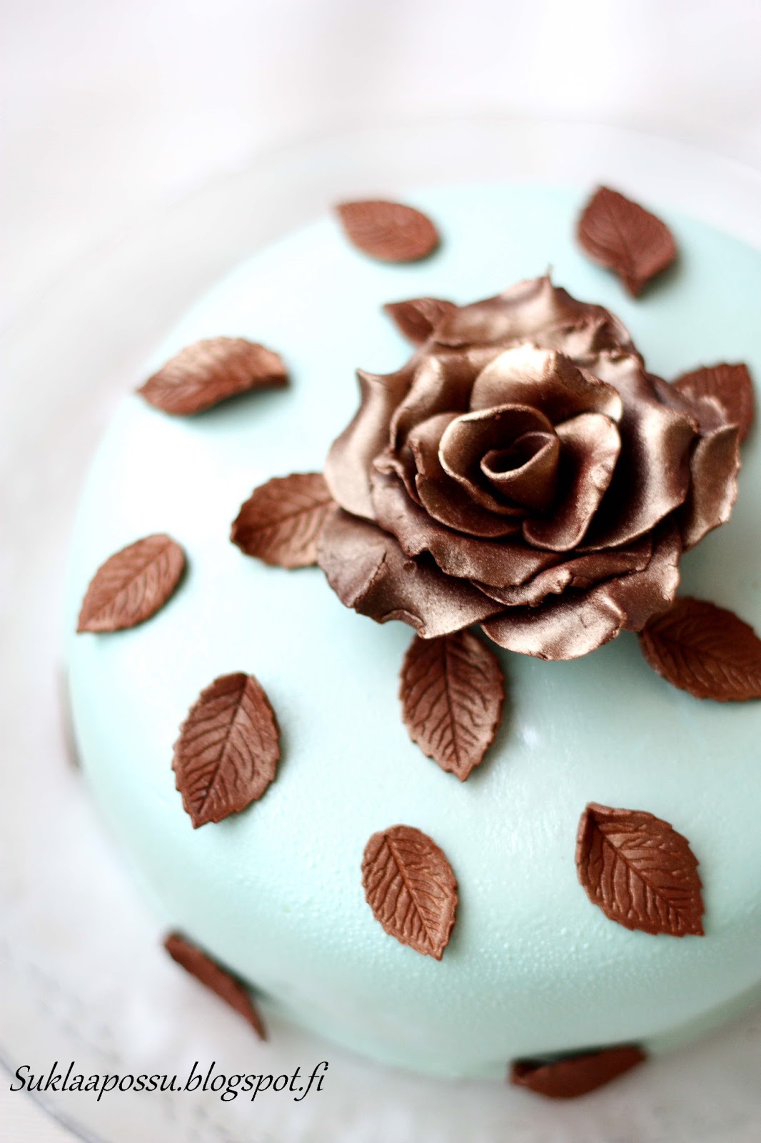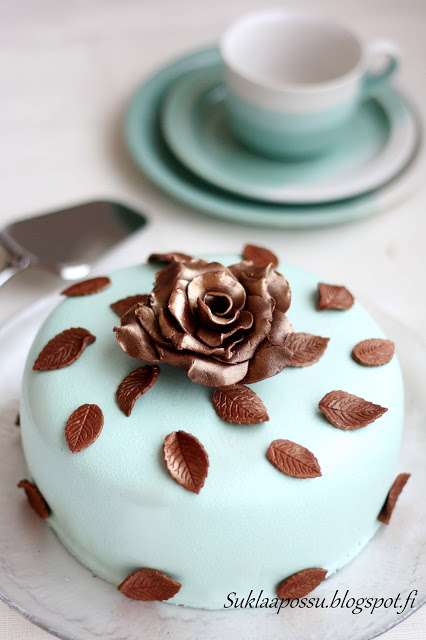 Tuhlasin kakkuun koristeiksi kaikki löytämäni suklaamassasta tehdyt koristeet, joiden pintaan olin suihkuttanut pronssista kimallesprayta.