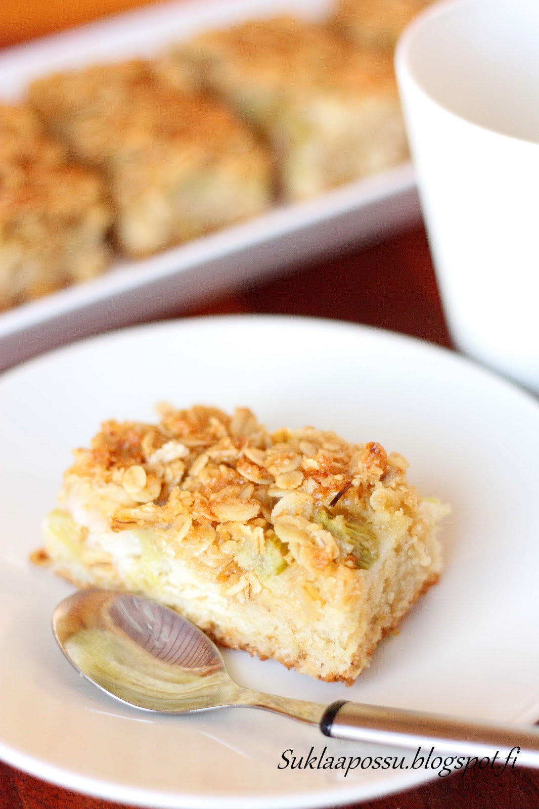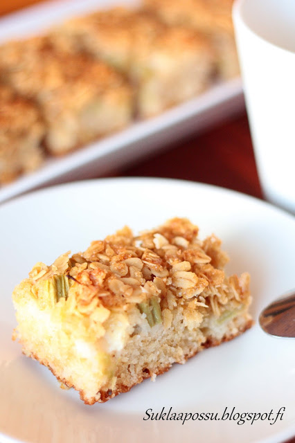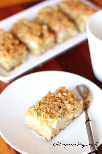 Tästä tuli siis lopulta ”vain” mehevä peruspiirakka rapealla päällisellä! Tämä on taas yksi niistä raparperileivonnaisia, joka maistui kahvipöydässämme erinomaisesti myös raparperia karttavalle syöjälle; varsinkin kun lautaselle lorautti hieman vaniljakastiketta, nams.