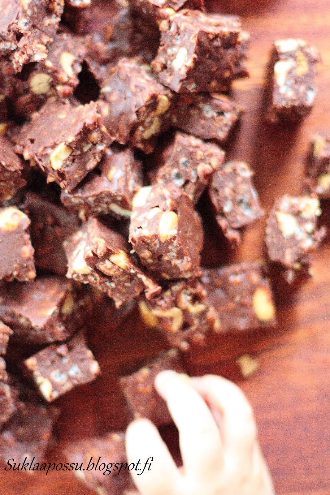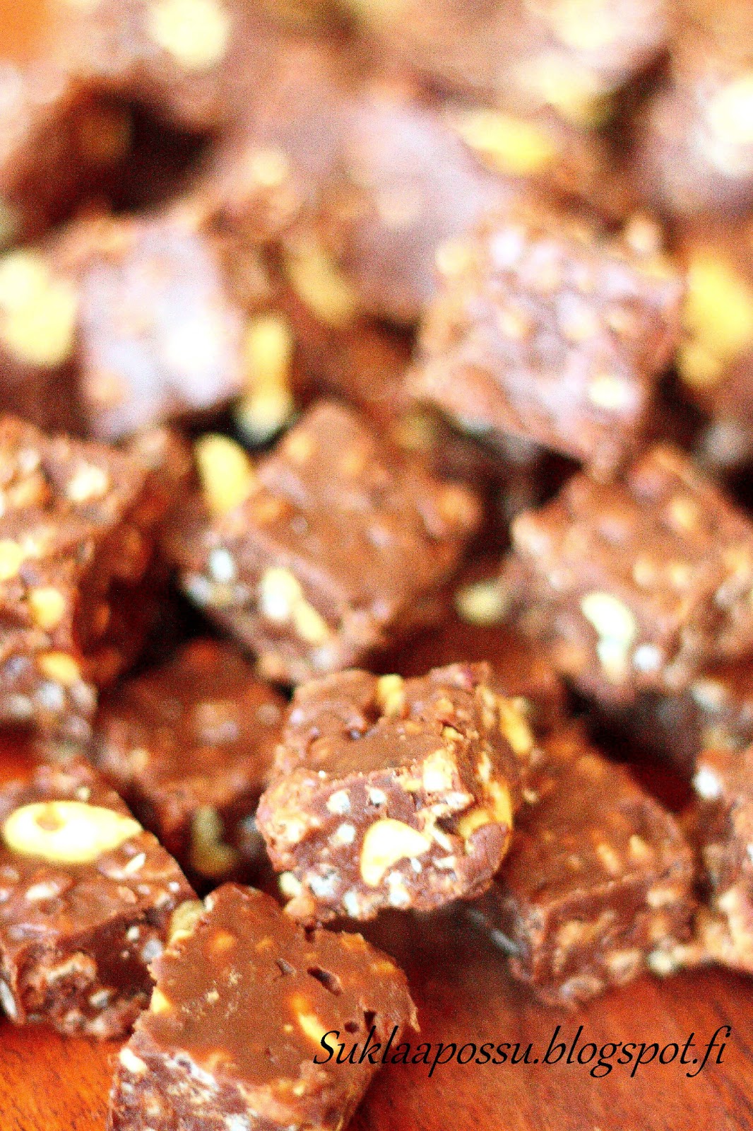 Loppupäätelmä on se, että riisimuroja olisi mielestäni voinut olla vähemmän. Noin puolet määrästä olisi riittänyt. Mies ei kylläkään pitänyt nykyistäkään määrää huonona. Korjasin kuitenkin omasta mielestä sopivamman määrän suoraan ohjeeseen. Kuten hieman aavistelinkin, murot menettivät rapsakkuutensa fudgemassassa, ja lopulta olivat jo hieman sitkeitä. Toisaalta aika kivalla tavalla. Muokkasin syoraan ohjeeseen myös suolapähkinöiden määrän, joita olisi saanut olla muutama enemmän. Mutta tällä kertaa mentiin näillä. Vaikka tekisin muutoksia, eivät nämä suinkaan pahoja olleet 🙂