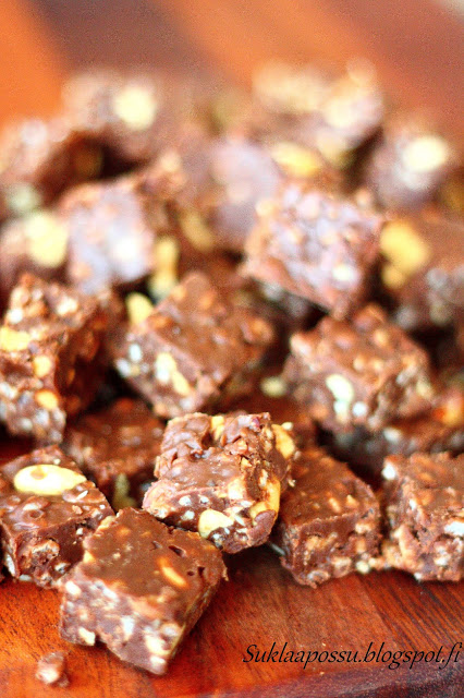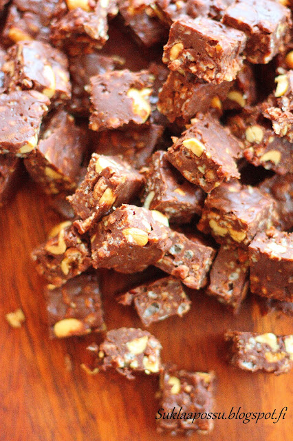 suolapähkinät ja sekoita nopeasti käännellen. Levitä massa leivinpaperoituun vuokaan (vaikka n. 23 x 35 cm) ja laita jääkaappiin hyytymään reiluksi tunniksi. Leikkaa palasiksi.