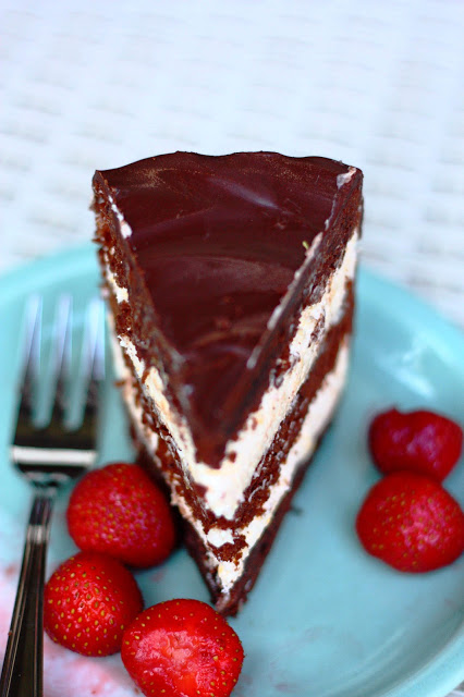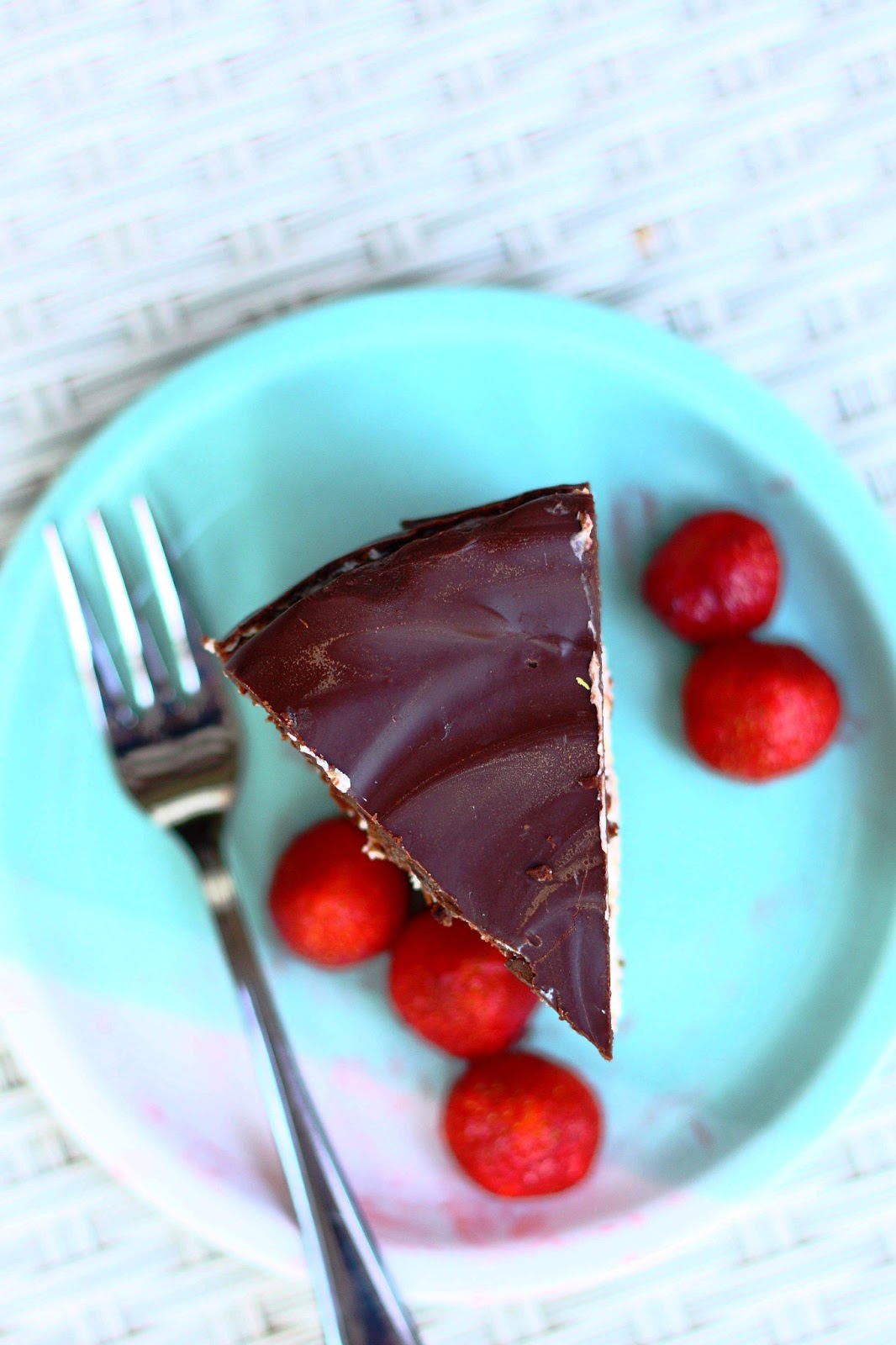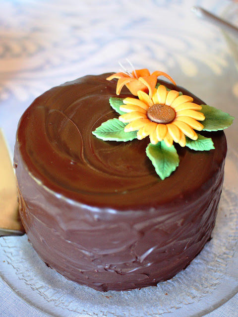 Testasin samalla kakkuun hieman erilaista suklaakuorrutusta. Ajatus oli tehdä kiiltävä ja suht kova, mutta hyvin leikattavissa oleva kuorrutus ja aikalailla sellainen tästä tulikin. Kuorrutuksen olisi saanut levitettyä kakun pintaan hyvinkin sileäksi, mutta halusin tehdä tarkoituksella hieman kotikutoisen näköisen.
