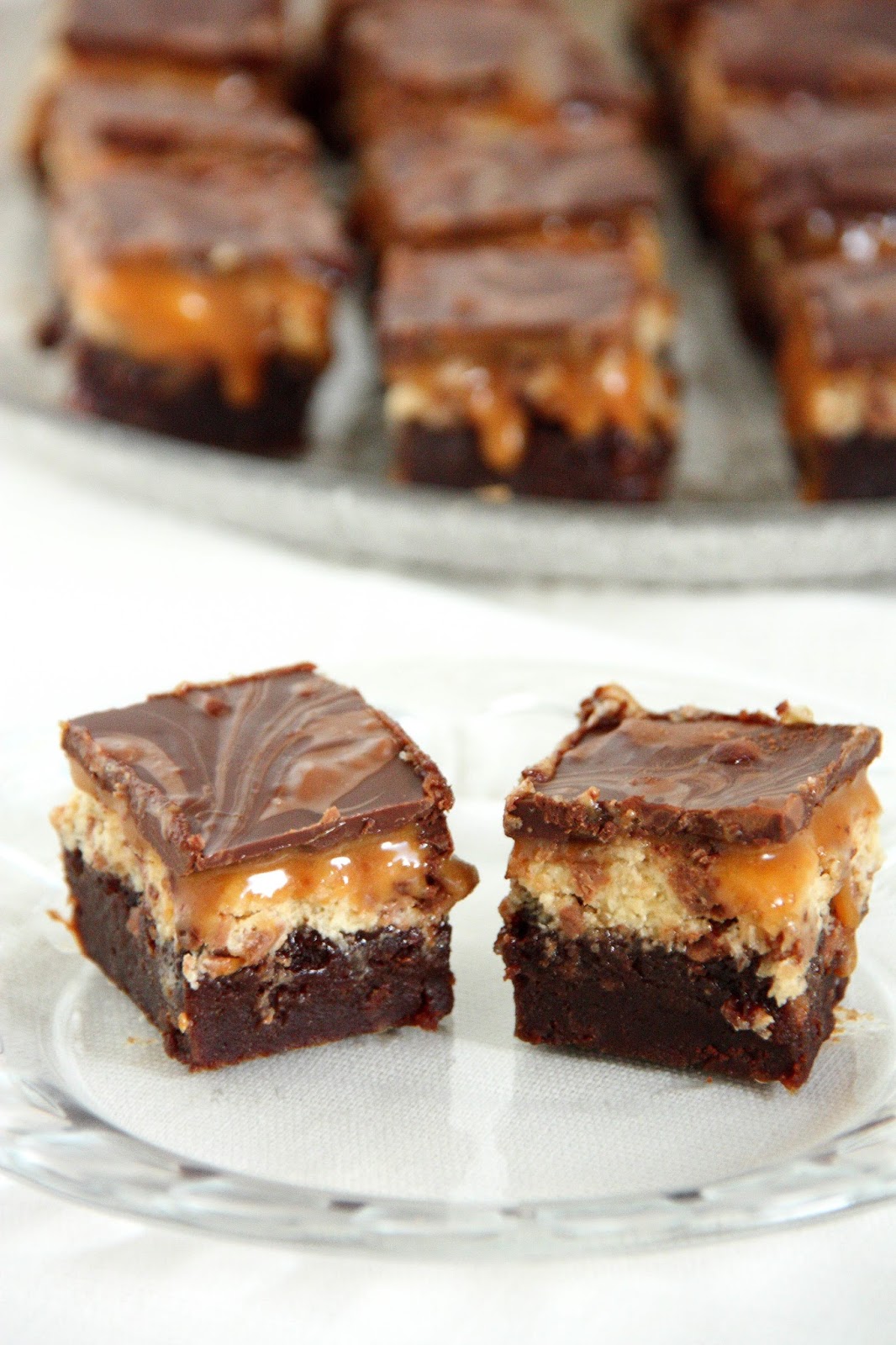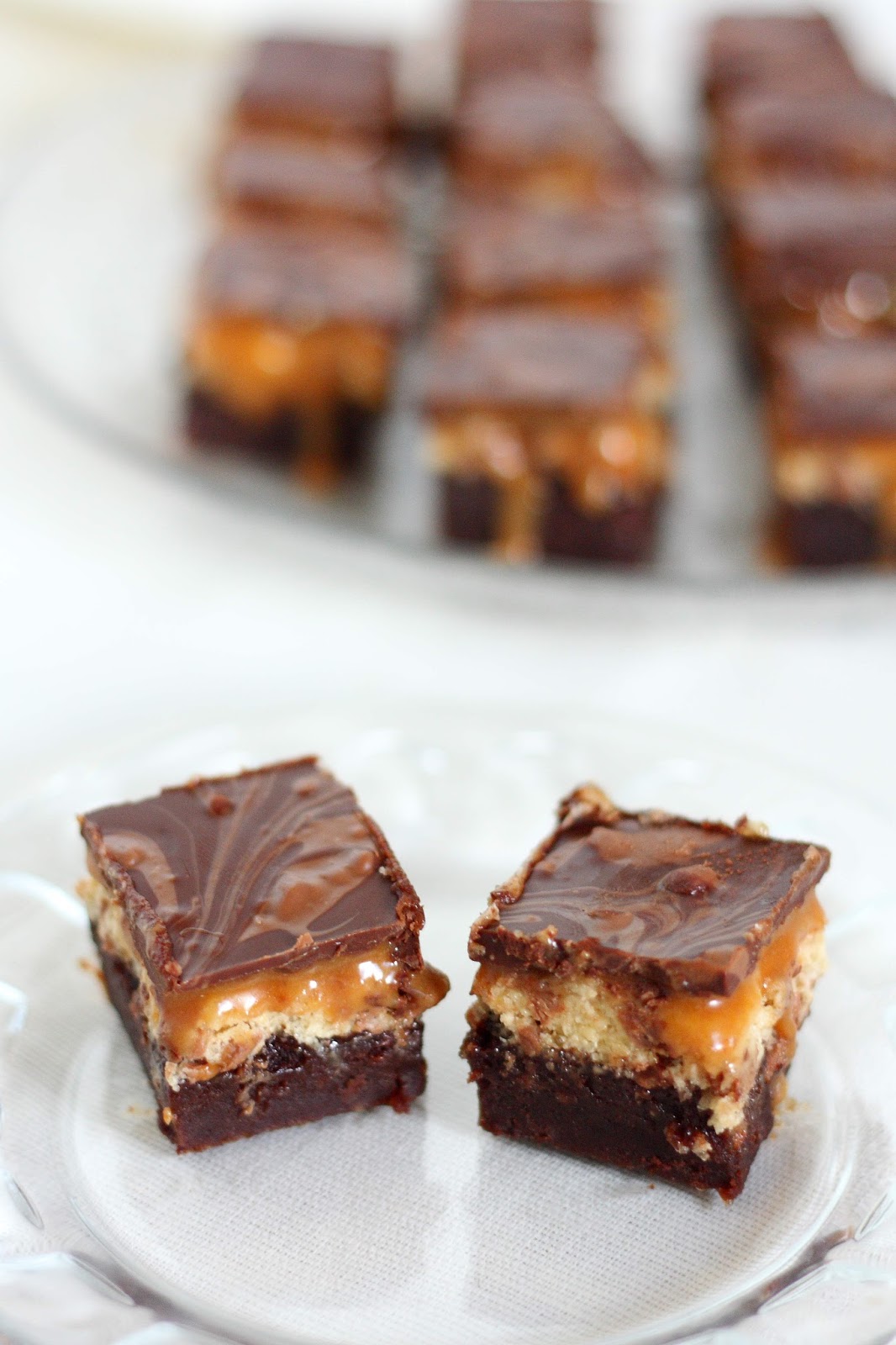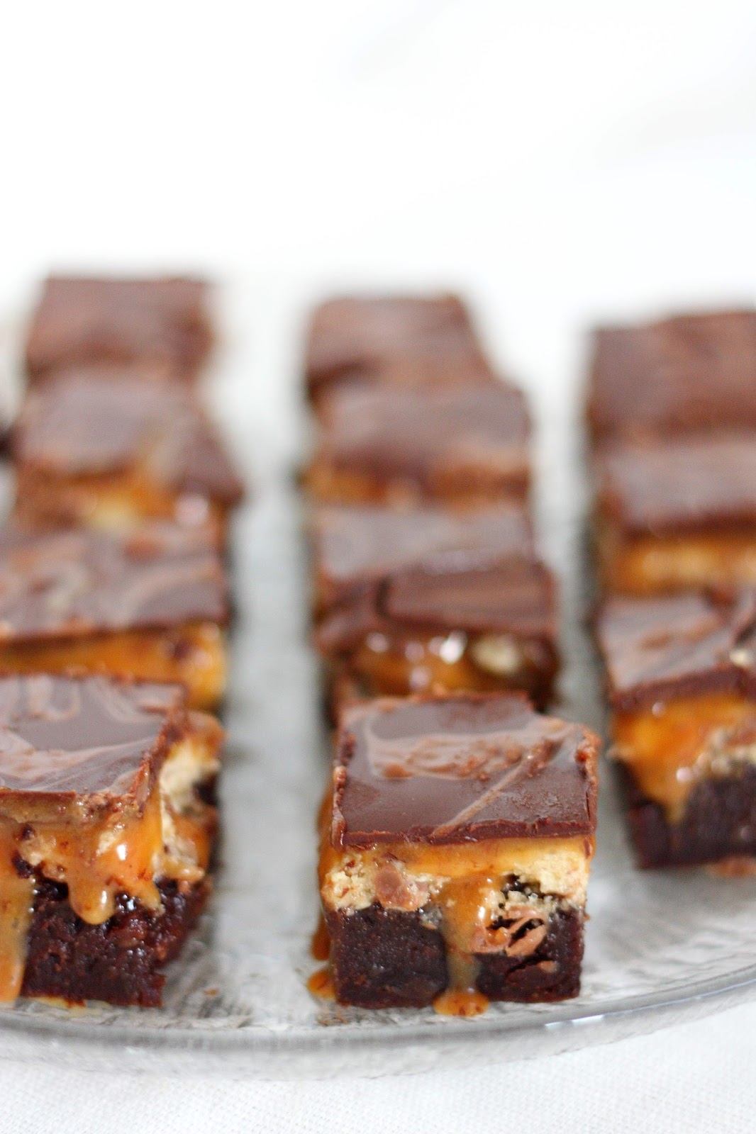Halusin leipoa jotain suklaista, mutta en osannut päättää mikä se voisi olla. Liikaa vaihtoehtoja, liian vähän aikaa. Parin päivän mietintätauon jälkeen päätin tehdä jonkin erittäin makean, pienen ja suklaisen herkkupalan. Muistin aiemmin tekemäni Cookie dough fudgen. Surffailtuani netissä, löysin kuvia, joissa cookie dough-seos oli yhdistetty kinuskiin. Näistä ideoista syntyi nämä pienet makeat palat. Näissä on brownies-tyyppinen pehmeä suklaapohja, jonka päällä se ihanan makea ja rapsakka cookie dough fudge-tyyppinen seos (cookie dough:n rapsakkuus tosin hälvenee parissa päivässä, mutta eipä se makua haittaa) Näiden päältä löytyy vielä pehmeää kinuskia sekä suussa rapsahtavaa suklaata. Hyvää! 🙂
