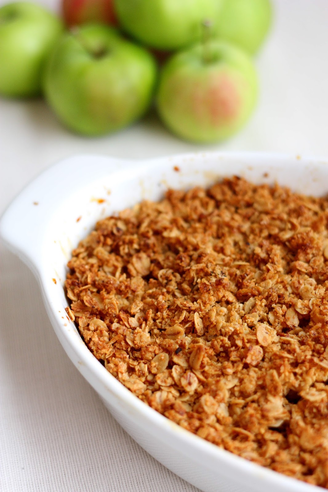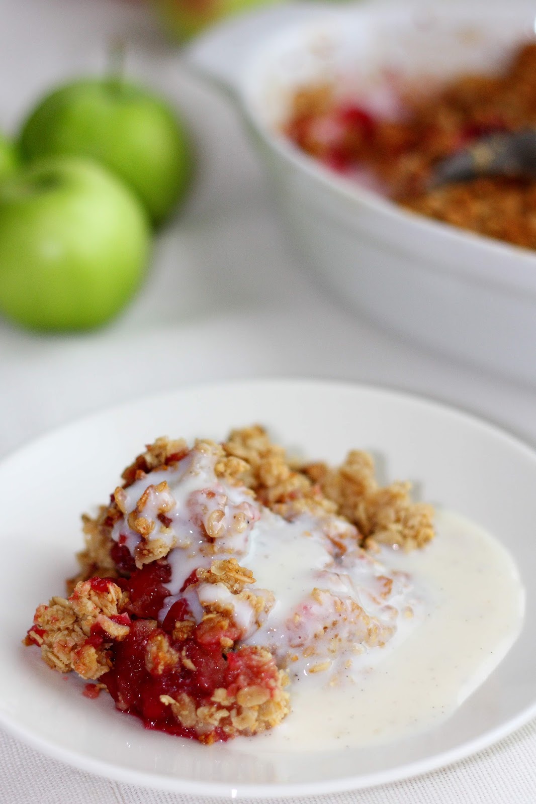 Tämä puolukansävyinen paistos oli vaihtelua omenaiselle versiolle. Mukaan olisi sopinut ripaus kanelia, kardemummaa tai vaikka vanilja. Kauramuruseos on ehdottomasti paras osa tässä! Rapea ja makea. Sitä olisi voinut olla vaikka tuplamäärä 🙂 Kuvissa näyttää, että sitä olisikin enemmän, mutta puolukat ja omenanpalat tuppautuivat suoraan lautasen pohjalle ja katosivat miltei kokonaan näkyvistä. Muruseokseen laitoin myös tällä kertaa mukaan mantelijauhetta. Se sopii tähän mielestäni hyvin tehden rakenteesta entistä rapeamman ja samalla jollain tavalla kuitenkin hieman kosteamman.