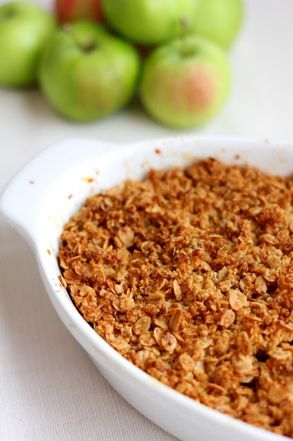 Tee muruseos sekoittamalla sulaan voihin muut aineet. Laita lohkotut omenanpalaset ja puolukat vuoan pohjalle. Valuta päälle siirappi ja sekoita hieman. Ripottele päälle muruseos. Paista 200 asteessa n. 20-25 minuuttia. Jos pinta alkaa tummua liikaa ennen kuin omenat ovat kypsiä, laita folio päälle. Tarjoile hieman jäähtyneenä kylmän vaniljakastikkeen kanssa.