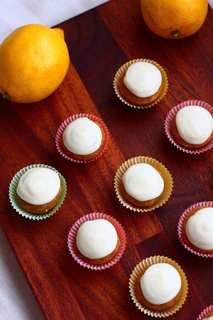Laitoin muffineihin nesteeksi jääkaapissa kököttänyttä appelsiini-mango-mehua. Vaikka muffini itsessään maistui mukavan hennon hedelmäiselle, halusin tehdä siihen vielä jonkin sopivan päällisen. Jääkaapista käteen tarttui Lemon Curd-purkki ja päätös oli valmis. Lemon Curd-kuorrute oli kuitenkin sen verran voimakkaan sitruunainen, että sen alta muffinin hennon hedelmäistä makua ei enää kuitenkaan erottanut, vaan yleisvaikutelma oli sitruunainen. Hyviä joka tapauksessa :)Lemon curd-kuorrute jäi hieman löysemmäksi kuin halusin, se pysyi juuri ja juuri muffinin päällä. Kuorrutteen maku oli kuitenkin hyvä. Muffinit itsessään ovat maidottomat ja maistuivat toki hyviltä myös ilman kuorrutusta. Nämä olivat aika kivoja, pieni, meheviä suupaloja 🙂 Myös nämä pääsivät työpaikalle ja katosivat pöydältä työpäivän aikana.