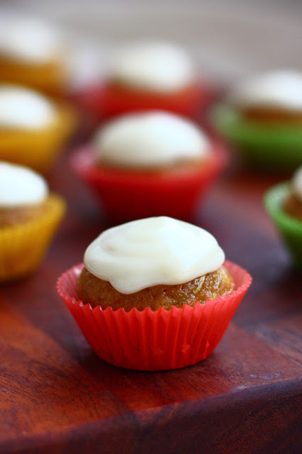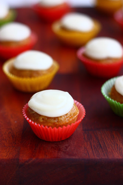 Sekoita fariinisokeri, öljyä, mehu ja munat keskenään hyvin sekaisin. Lisää keskenään sekoitetut kuivat aineet hyvin sekoittaen, älä kuitenkaan vatkaa sen enempää kuin tarpeen. Sekoita joukkoon lopuksi kesäkurpitsaraaste nopeasti sekoittaen. Jaa taikina voideltuihin minimuffinipellin koloihin.