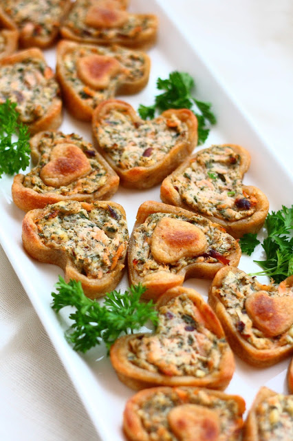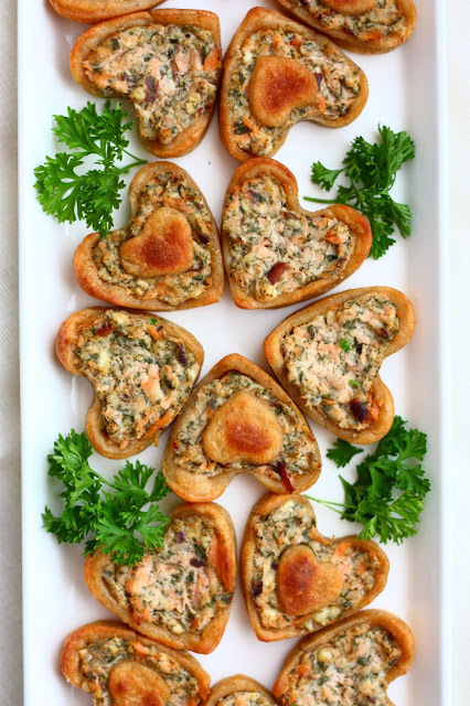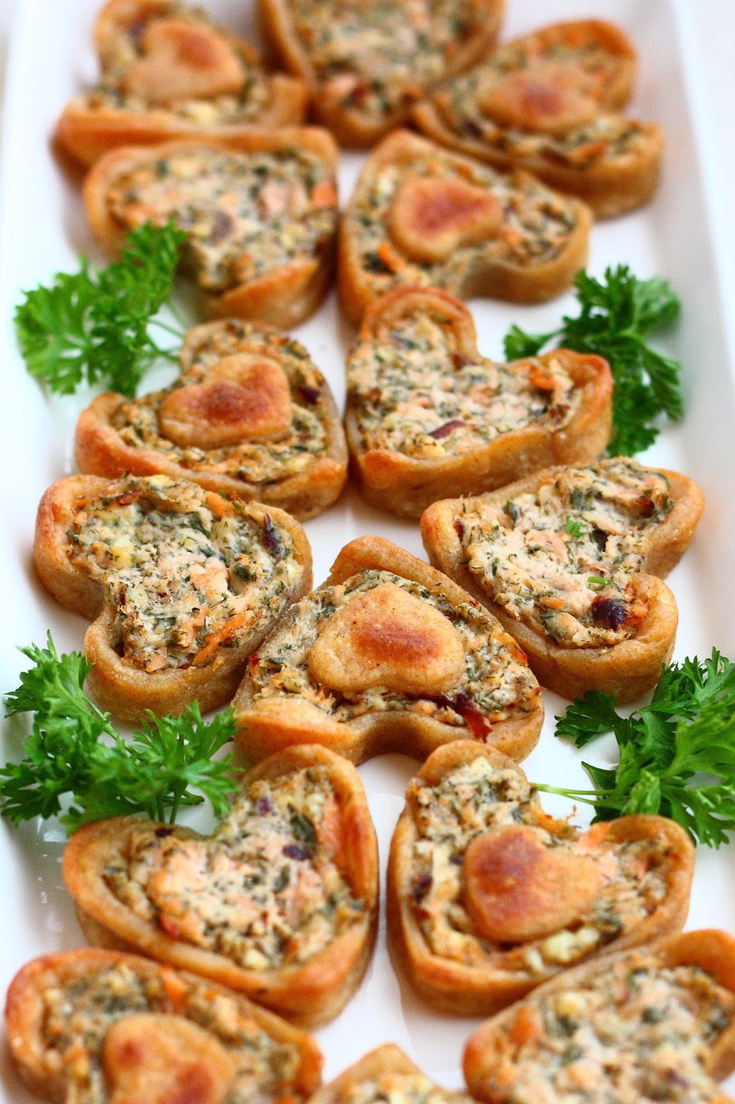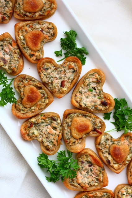 Viikonloppuna vietimme kuopuksemme 1-vuotissyntymäpäivää. Niin se aika vain menee, huimaa vauhtia, viuh vaan. Ja niin menivät juhlatkin. Juuri kun ehtivät alkaa, ne jo loppuivat. Synttäreitä juhlitaan kahtena peräkkäisenä viikonloppuna, joten ensi viikonloppuna olisi luvassa uudet juhlat ja uudet tarjottavat. Mutta ennen sitä luvassa tämän viikonlopun juhlatarjoilua. Tulossa näiden savulohi-sydämien lisäksi mm. paljon kehuttu aurajuustopiirakka, ihastuttava pepperonipiirakka, ricotta-savulohitäyte tötteröihin/palttoonapeille, suklaakeksit kinuskisydämellä(!), minttusuklaafudget, ihailuja kerännyt fazerina-suklaakakku ja puolukkatäytteinen täytekakku.