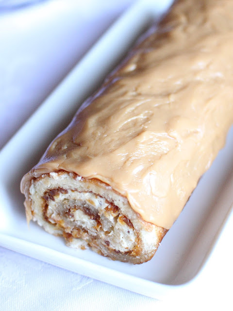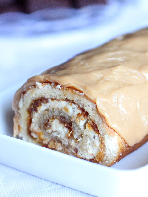Valmista kuorrutusta varten kinuski. Sekoita kerma, sokeri ja siirappi kattilassa. Keitä hiljalleen, välillä sekoittaen noin 10-15 minuuttia (alk.per. 20 minuuttia) tai kunnes tippa jähmettyy kylmään veteen. Rouhi suklaa. Sulata lopuksi suklaarouhe kinuskiin. Anna kinuskin jäähtyä ja jähmettyä hieman. Kaada kinuski kääretortun päälle ja anna valua reunoille. Koristele poikittaisilla suklaaraidoilla.