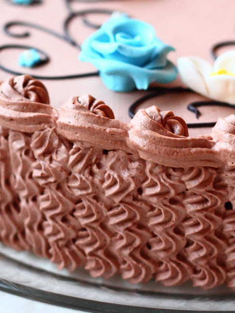 Koska mieheni rakastaa tiramisua, laitoin suklaan ja kahvin lisäksi täytteeseen tiramisusta tuttua amarettoa antamaan hieman lisäaromia. Sitä olisi voinut olla vaikka enemmänkin, koska nyt maku hukkui liki täysin suklaan ja mokan joukkoon. Kuorrutteeksi laitoin miehen toiveesta kaakaokerman, jota höystin hieman espressojauheella. Kermakuorrutteinen kakku olikin siitä kiva, että pääsin itsekin pitkästä aikaa harjoittelemaan kunnolla pursottelemista. Reunat tein 8 millisellä tähtityllalla heiluttelemalla sitä pursottamisen aikana hieman sivulta sivulle. Aloin pikkuhiljaa päästä jyvälle tekniikasta, joten pursotusjälki hieman vaihtelee kakun eri osissa. Huonoimmat osat korjasin, mutta aikapulan takia en lähtenyt uusimaan koko reunusta. Tuon yläreunaa kiertävän kiekurapursotuksen tein muistaakseni hieman isommalla tähtityllalla, oisko ollut 11mm. Kokonaisuudessaan pursotuksista tuli mielestäni paljon paljon paremmat kuin joskus ennen muinoin 🙂 Harmillisesti kakku tarjottiin vasta seuraavana päivänä, jolloin kerma oli alkanut repeilemään pahasti. Päällisen olisi voinut koristella täytteen kaltaisella moussellakin, niin se olisi kestänyt paremmin hyvännäköisenä..