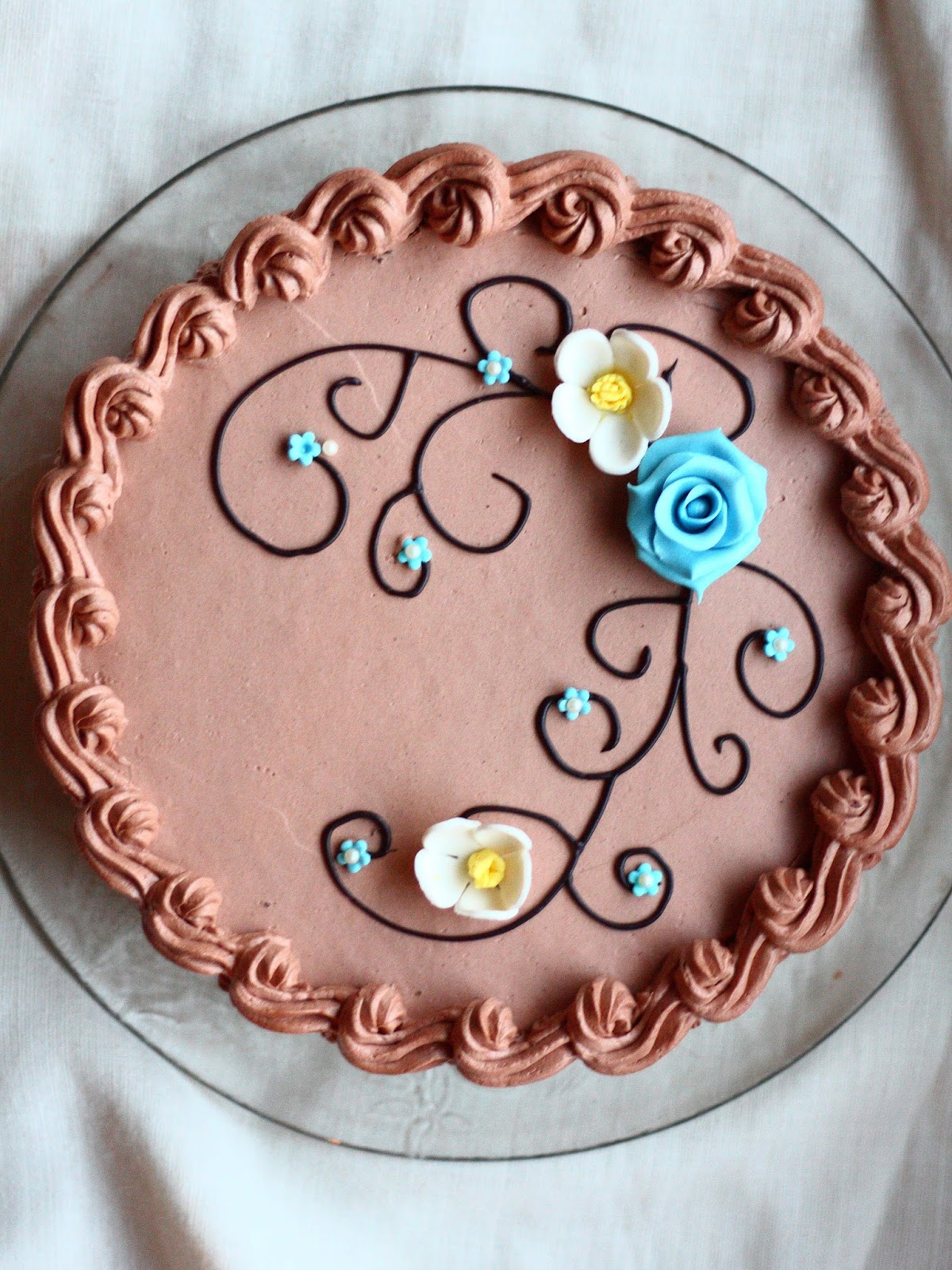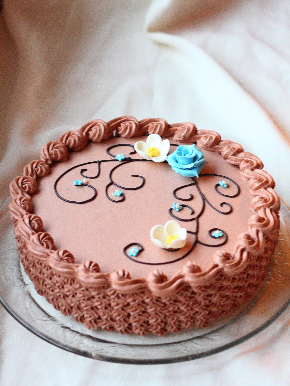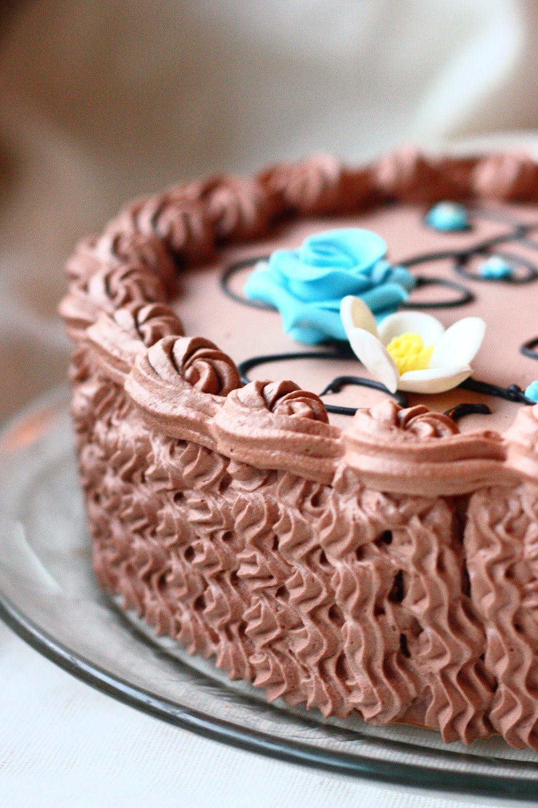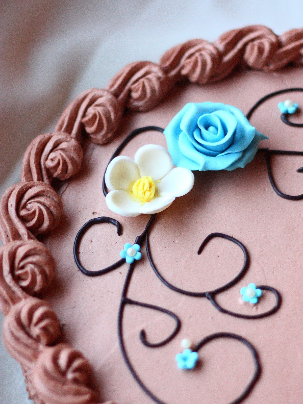 Koska mieheni rakastaa tiramisua, laitoin suklaan ja kahvin lisäksi täytteeseen tiramisusta tuttua amarettoa antamaan hieman lisäaromia. Sitä olisi voinut olla vaikka enemmänkin, koska nyt maku hukkui liki täysin suklaan ja mokan joukkoon. Kuorrutteeksi laitoin miehen toiveesta kaakaokerman, jota höystin hieman espressojauheella. Kermakuorrutteinen kakku olikin siitä kiva, että pääsin itsekin pitkästä aikaa harjoittelemaan kunnolla pursottelemista. Reunat tein 8 millisellä tähtityllalla heiluttelemalla sitä pursottamisen aikana hieman sivulta sivulle. Aloin pikkuhiljaa päästä jyvälle tekniikasta, joten pursotusjälki hieman vaihtelee kakun eri osissa. Huonoimmat osat korjasin, mutta aikapulan takia en lähtenyt uusimaan koko reunusta. Tuon yläreunaa kiertävän kiekurapursotuksen tein muistaakseni hieman isommalla tähtityllalla, oisko ollut 11mm. Kokonaisuudessaan pursotuksista tuli mielestäni paljon paljon paremmat kuin joskus ennen muinoin 🙂 Harmillisesti kakku tarjottiin vasta seuraavana päivänä, jolloin kerma oli alkanut repeilemään pahasti. Päällisen olisi voinut koristella täytteen kaltaisella moussellakin, niin se olisi kestänyt paremmin hyvännäköisenä..