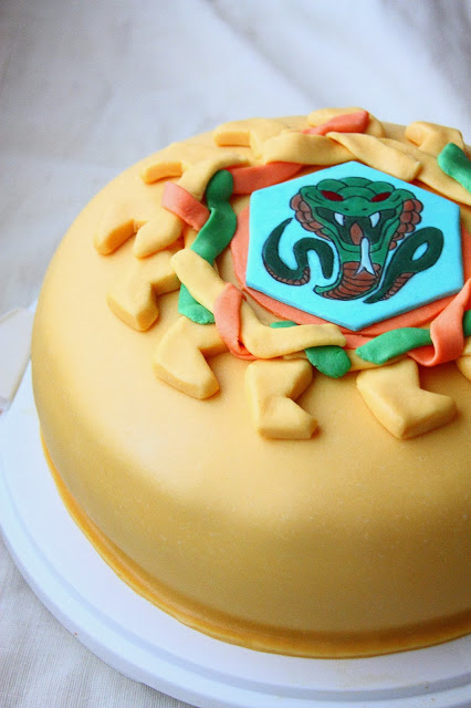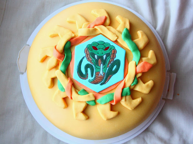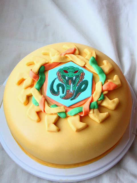 Työkaverini poika täytti vuosia ja sain pyynnön tehdä kakun. Työkaverini kertoi pojan pitävän Beyblade-kiekoista ja heitti myös ilmaan ajatuksen ruskan värisestä kakusta. Koristelun suhteen sain kuitenkin täysin vapaat kädet, mutta ajattelin yhdistää nuo kaksi asiaa kakkuun. Beyblade oli minulle ennestään tuntematon, joten selaus netin syövereissä paljasti niiden olevan pelikiekkoja, joissa on jokin kuvalaatta keskellä. Ajattelin aluksi tehdä kakun päälle pelkän löytämäni Poison-nimisen kiekon kuvalaatan ja muutaman vauhtiraidan sivuille. Suunnitelma kuitenkin muuttui koristelupäivän aamuna, jolloin päätin yrittää tehdä päälle koko kiekon. Koristeluvaiheessa kiekon malli oli kuitenkin tietokoneella ja kone toisessa päässä taloa, joten koitin pärjätä edes jotenkuten ulkomuistista. Mies kävi pyörimässä kakun vieressä ollessani koristelupuuhissa ja katseli ihmeissään mitä touhuan. Aloin jo itsekin epäilemään ajatuksenkulkuani eikä kakku kyllä näyttänytkään siltä kuin olin ajatellut.. Sain kuitenkin myöhemmin päivällä viestin pojan äitiltä, että poika oli kakun nähdessään kiljunut riemusta, sillä kakun päällä oli sattumalta juuri hänen lempikiekon merkki 🙂