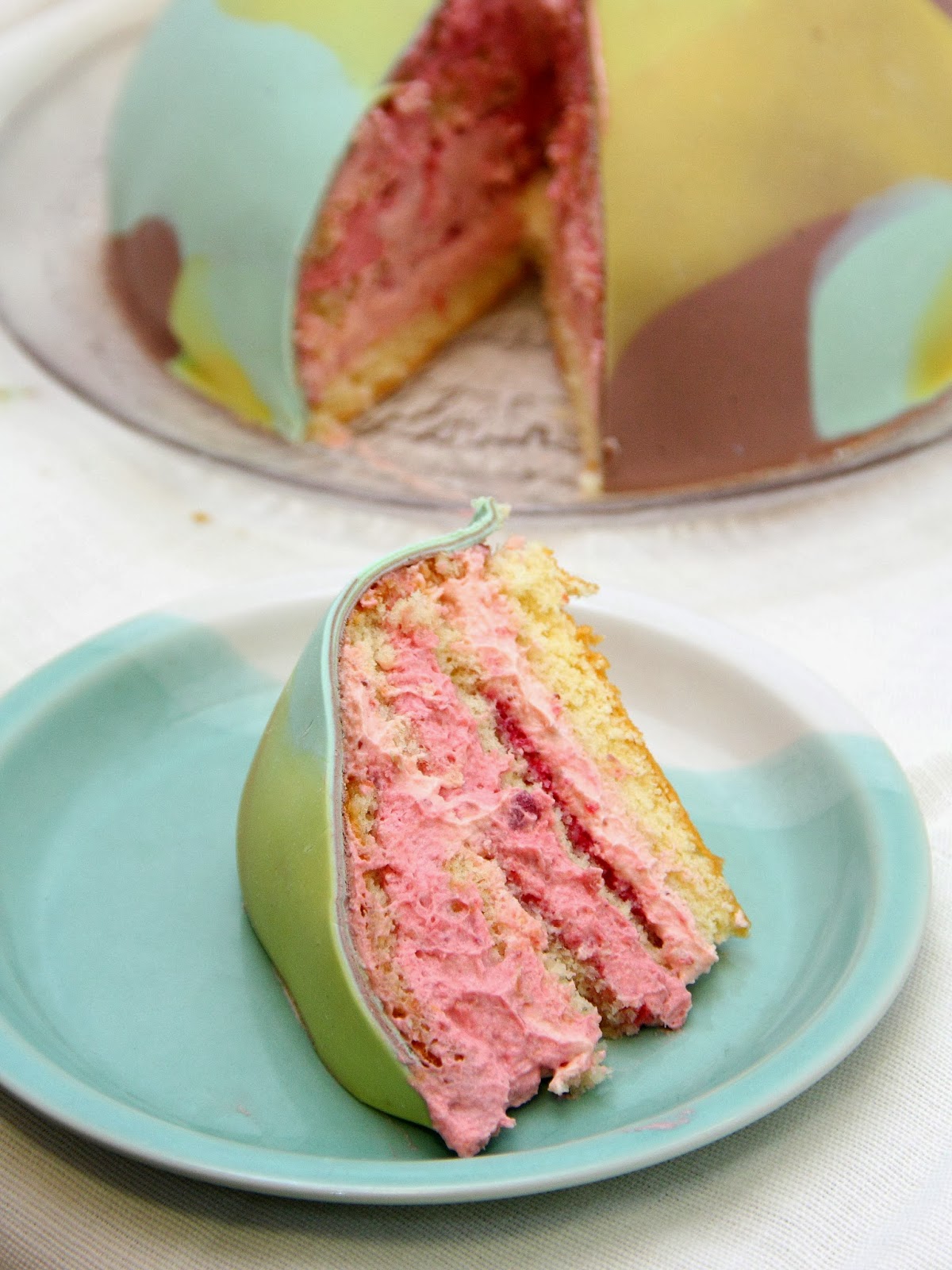 Tein täytteen välillä seoksen paksuutta tunnustellen ja jouduin käyttämään kreemijauhetta sen verran paljon, että mansikan maku oli tuoreeltaan maisteltuna hieman häviksissä. Vadelmatäyte oli sen sijaan hyvänmakuista, mukavan raikasta. En tiedä mahdoinko käyttää kreemijauhetta liikaa, mutta vähemmällä määrällä se ei olisi ehtinyt hyytymään tarpeeksi, sillä halusin korkata kakun samana iltana. Seuraavana päivänä täytteiden maut olivat tasoittuneet ja mansikkatäytekin maistui taas enemmän mansikalle, hyvin miedosti tosin. Kostuttelin pohjat laittamalla ohuelti täytteistä ylijäänyttä mansikka-/vadelmasosetta kakkupohjalle ennen täytteen levittämistä ja se olikin hyvä ajatus, sillä ne korostivat mukavalla tavalla täytteiden omaa makua.