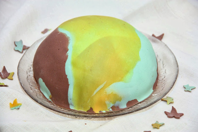 Koska kakku oli vain testikakku ja tuli oman perheen kesken syötäväksi, en kiinnittänyt koristeluun sen enempää huomiota. Kaivoin kaapista esille kolme pientä jäljellä olevasta eriväristä valkosuklaamassan palasta, sekoitin ne puolhuolimattomasti toisiinsa ja kaulitsin massan kakun päälle. Leikkelin samasta massasta myös muutaman muratin lehden ajatuksena laittaa ne kakun päälle, mutta ne päätyivätkin ihan muualle, sillä tuo pinta oli mielestäni aika kiva jo noinkin 🙂